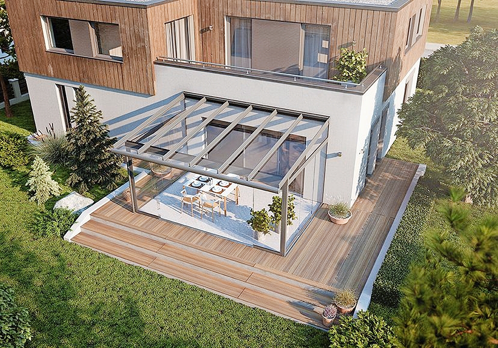 Zahlreiche Dachvarianten ermöglichen verschiedenste Nutzungsweisen für eine Terrasse. Wer einen Regen- oder Sonnenschutz sucht, benötigt in der Regel nur eine Überdachung. Soll der Nutzungszeitraum auch den Frühling und Herbst miteinschließen, lohnt sich die Installation von Glasschiebewänden, die die Terrasse in einen Sommergarten verwandeln. "Terrassendächer kombiniert mit leichtgängigen Schiebe-Dreh-Systemen schützen den Terrassenbereich vor plötzlich aufkommendem Wind oder kühleren Temperaturen", erklärt Schneider. Weitere Ausstattungselemente wie LED-Beleuchtung, Heizstrahler oder Lautsprecher können die Terrasse zudem in einen gemütlichen Wohnraum im Garten verwandeln.