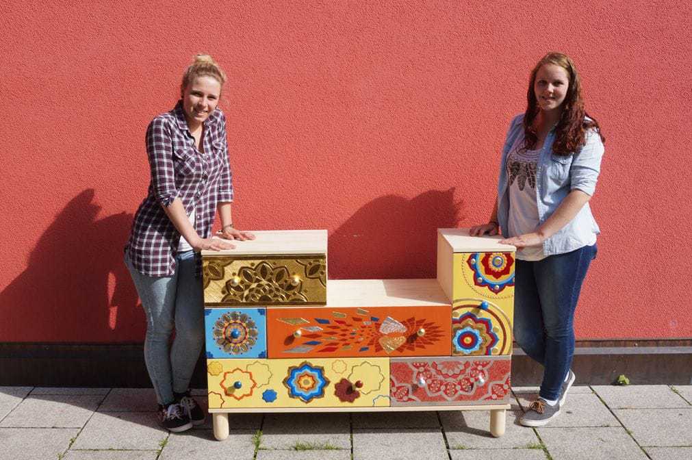 Zur Verschönerung des Foyers der Firma Grüner GmbH kreierten Timna Eulenhaupt und Franziska Grüner eine Holzkommode mit dem Schwerpunkt „edel und praktisch“. Bei der Gestaltung der Holzkommode wurde jede der sechs verschieden großen Schubladentüren mit unterschiedlichen Techniken der Vergolderei verziert. Durch die richtige Zusammenstellung von Farbharmonie und Materialien wurde trotz der individuellen Gestaltung ein stimmiges Bild aus dem Möbelstück.