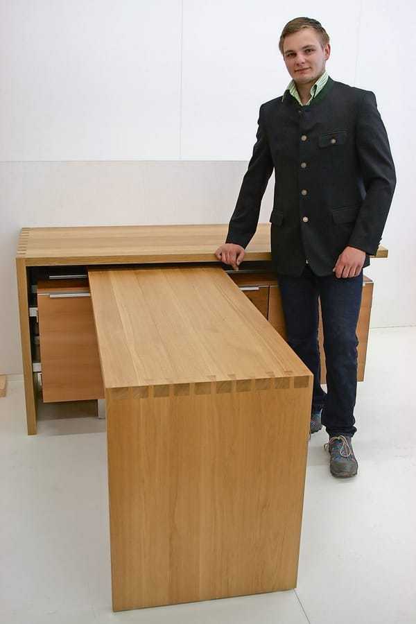Für seine Meisterarbeit am Wifi Salzburg wollte Lukas Krispler ein Meisterstück anfertigen, das nicht nur ein Blickfang sein sollte, sondern auch besonders zweckmäßig verwendet werden kann. So entstand ein Meisterstück, das gleich zwei Funktionen in sich vereint, was jedoch auf den ersten Blick nicht gleich ersichtlich ist. Im „geschlossenen“ Zustand ist es ein Sideboard, das mit wenigen Handgriffen zu einem Schreibtisch wird. So kam Krispler auf den Namen „Verwandlungskünstler“.