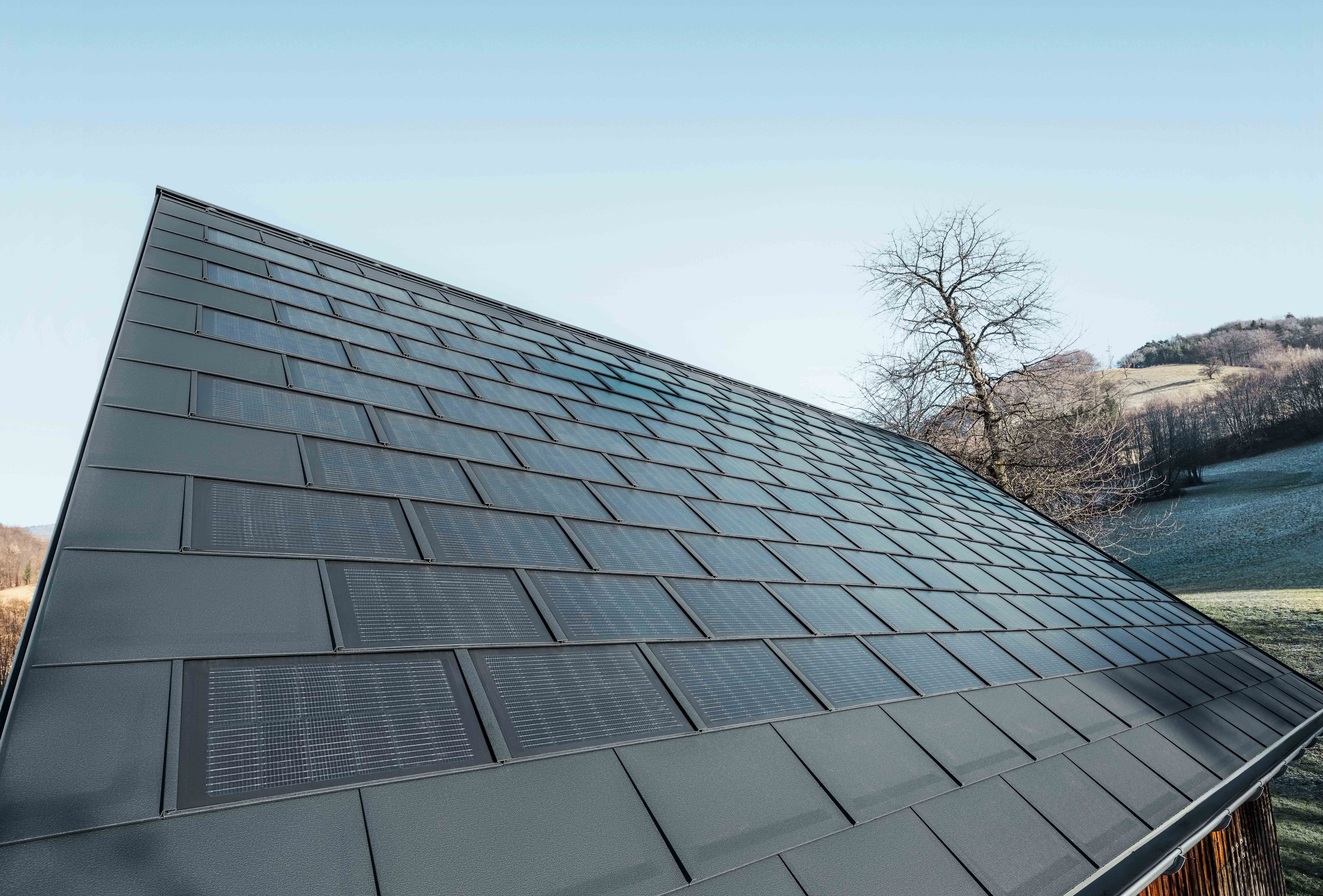 Das widerstandsfähige, reflexionsarme Solarglas in Kombination mit der Prefa Dachplatte aus Aluminium hält extremen Wetterereignissen stand.