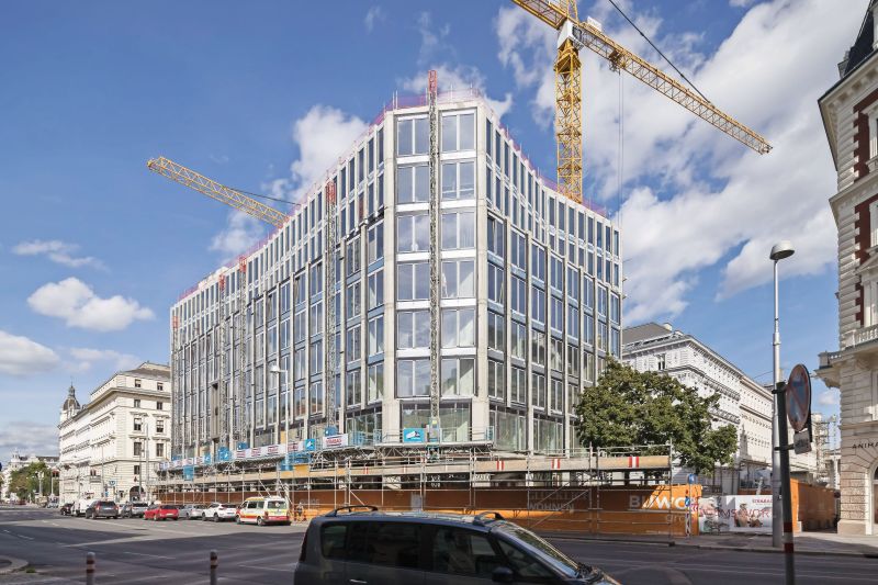 Als zeitgenössisches Zeichen erkennbar, orientiert sich die Gliederung der sieben Geschoße an den Nachbargebäuden wie etwa das Sockelgeschoß mit Arkade und Mezzanin.Die Traufenhöhe liegt bei 52 Meter über Wiener Null, wie jene der Gründerzeitbebauung. Die zwei darüber befindlichen Attikageschoße knicken an jeder Front schräg zur Mitte um zwei Meter ein. Dieses Motiv der einspringenden Fassade ist eine gestalterische Antwort auf die Gründerzeit und auf Achsensprünge im unmittelbaren Umfeld, wie der hier abknickende Verlauf der 2er-Linie oder der Knick der Einmündung von Josefstädter Straße und Stadiongasse. Auch der für repräsentative Bauten des 19. Jahrhunderts übliche Innenhof findet sich im Neubau wieder. Angesichts der schmalen Hüften relativ klein geraten, gewährleistet er zusätzliche Tageslichtqualität in der Kernzone. Aktuell befinden sich hier Erschließungsflächen, Begegnungszonen, Küchen, Sanitär- und Nebenräume. Die Bauhöhe war im Rahmen des Wettbewerbs, an dem sich 144 Büros beteiligt hatten, noch offen, eine Landmarke mittels Hochhauses an dieser durch den Straßenknick speziellen Position schien möglich. „Wir waren uns schnell sicher, uns hier städtebaulich einzupassen und dies am Projekt ablesbar machen zu wollen“, sagt Johanna Schuberth. Die Blickachsen und die strenge Ausrichtung der Gebäudeflucht nehmen Bezug zu den Nachbarbauten. Auch die Idee der markanten Rücksprünge ist eine Antwort auf die umliegenden Attikageschoße. Im Vergleich zum Vorgängerbau überwiegt der Eindruck einer geringeren Ausnützung des Bauplatzes, wenn auch die Baulinie ident verläuft, so ließen ihn die erkerartigen Auskragungen wuchtig und gedrungen erscheinen. Die einst zur Sicherung der Baugrube errichtete Schlitzwand wurde für den neuen Stahlbetonbau verwendet. Flachdecken sind ohne Unterzüge ausgeführt, die Elemente zur vertikalen und horizontalen Lastabtragung sind aus Stahlbeton.
