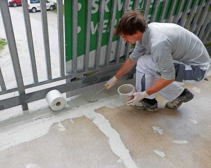 Oft finden Verarbeiter einen Materialmix vor, zum Beispiel eine Kombination von Beton auf dem Boden und Blech an den Wandanschlüssen. In diesem Fall gilt es zu beachten, dass die Wärmeausdehnung bei jedem Material verschieden ist. Bewegungen in der Konstruktion, die sich daraus ergeben, müssen vor der Entscheidung für eine Abdichtungslösung in die Planung miteinbezogen werden. Nur so ist die schadlose Aufnahme von Bauwerksbewegungen langfristig gesichert. Die technischen Unterlagen der Flüssigkunststoffhersteller geben deshalb Hinweise darauf, welche Vorbehandlung des Untergrunds – je nach Werkstoff – notwendig ist, um eine vollflächige Haftung sicherzustellen. Ist diese gewährleistet, kann im Vergleich zu klassischen Bahnenabdichtungen auf eine mechanische Befestigung am oberen Rand verzichtet werden.