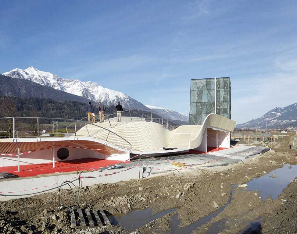 Eine offene Spiellandschaft mit neuen Spieltypologien richtet sich an die jungen Besucher. Sie soll auch lokal ansässige Familien mit Kindern zwischen vier und 14 Jahren in den Park locken, die sonst nicht zu den typischen Swarovski-Kunden zählen. Beim Versuch, Spiele dreidimensional zu denken, haben sich die Architekten von Snøhetta ihre Kinderträume erfüllt. Es ist ein Spielplatz voller Abenteuer. Statt einer simplen Sandkiste gibt es einen bodennahen Überraschungsraum. Entlang einer mit Kantholz belegten, gekrümmten Stahlplatte mit Holzausfachungen entwickeln sich verschachtelte Räume, bestückt mit verschiedenen Spielgeräten wie Spiegel, Rutschen und – ja auch – einer Sandkiste. Gleich daneben steht der Spielturm, vor Überlastung schützt ihn eine Zugangszählung, die maximal 120 Personen Eintritt gewährt. Das Beton-Stahl-Tragwerk reicht über sieben Geschoße, davon sind die oberen vier Spielebenen, der Rest ist anderen Nutzungen vorbehalten. 170 Glasscheiben unterschiedlichen Zuschnitts und in verschiedenen Winkeln montiert bilden die Außenhaut. Die Gläser sind mit jenen Swarovski-Tieren bedruckt, die sich weltweit als Souvenir und Sammlerstücke verbreitet haben. Der Baukörper vermittelt den Eindruck eines verspielten Kristalls. Er ist bauphysikalisch dicht, wirkt aber luftig. Im Inneren dominiert eine Farbskala aus dem Bereich der Rottöne. In jedem Geschoß gibt es ein anderes Spielangebot: eine Holzhöhle aus Leimbinder mit angearbeiteter Krümmung, zwei in den Boden eingelassene Trampoline, ein gespanntes Stahlnetz als Estrich, eine Edelstahlrutsche über ein Geschoß, große Puzzleteilen an den Wänden. Um Verletzungen abzuwenden, sind an kritischen Stellen weiche Matten ausgelegt. Sicher ist, dass auch abenteuerlustige Erwachsene am Spielangebot viel Freude haben werden.