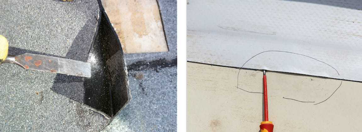 Wenn man die beiden Bilder betrachtet, so zeige ich bei einem Bild die Schweißnaht einer hochpolymeren Dachbahn, die bei einer Temperatur, die nach Bautagesbericht und Wettererhebungen bei –5 °C lag, verarbeitet worden ist. Das Öffnen der Schweißnaht an der Nahtkante zeigt, dass die Schweißtemperatur an dieser Stelle mit dem Schweißfenster nicht übereingestimmt hat. Wir alle wissen aus Erfahrung: Zuerst merkt man von der zu kalten Schweißtemperatur nichts, nach mehreren Temperaturwechseln lösen sich die beiden Folien dann plötzlich voneinander. Der Mangel ist da, bei T-Stößen kommt es zu einem Wassereintritt, da ein Haarröhrchen entsteht.
