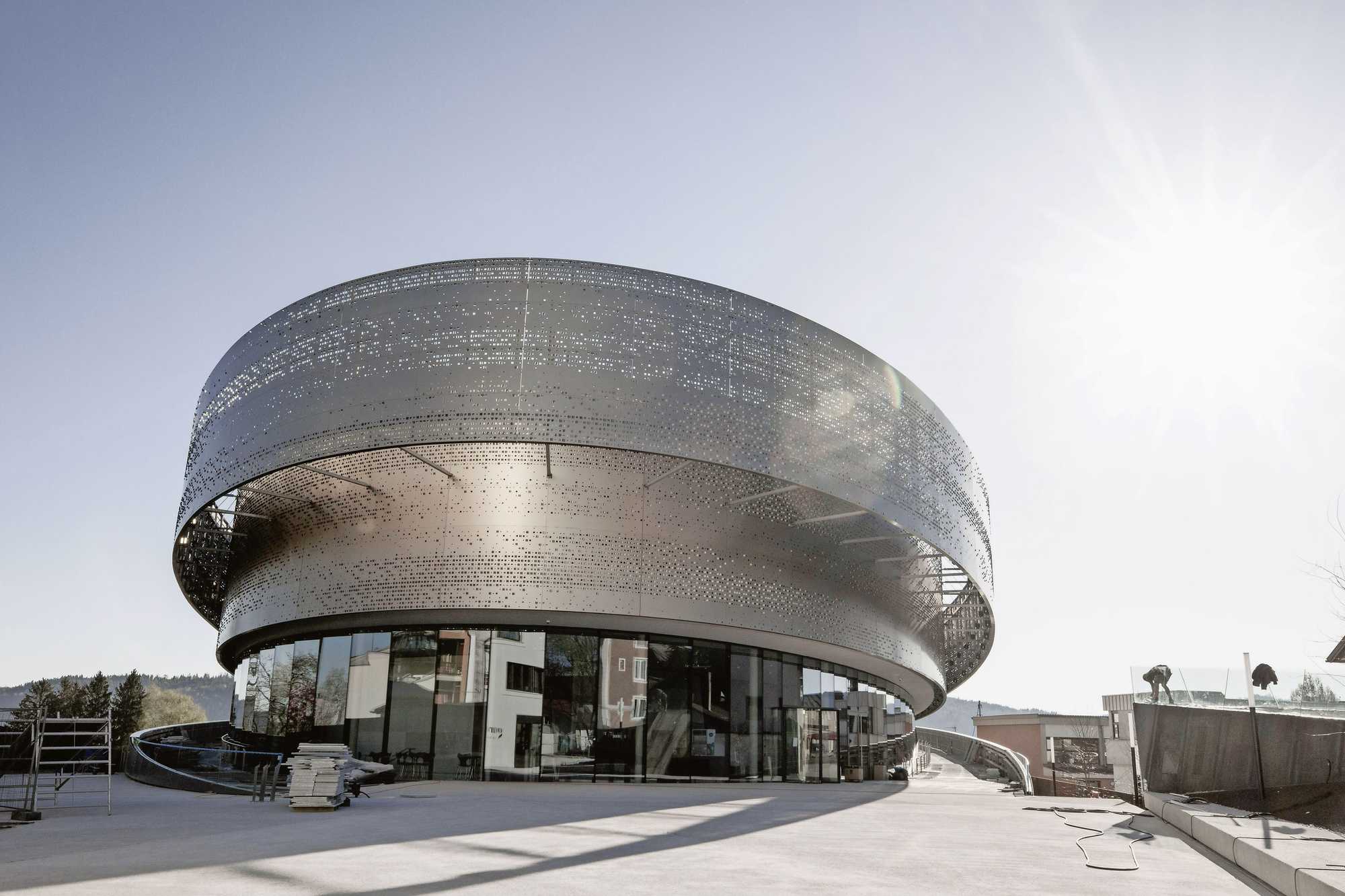 Die tragenden Strukturen, wie Außenwände, Decken und Fußböden, sind aus hochwertigem Stahl- und Sichtbeton. Beton und Metall als Materialien schienen den Architekten zum Thema Motocross, Straßen, Felsen, Steinen passend. Die Fußböden sind aus in Terrazzo-Optik geschliffenem und versiegeltem Beton. In den Beton eingelassen befinden sich auch Flachkanäle für die Lüftungsleitungen. Die das Auge dominierende Außenhaut, die in einigem Abstand aufgehängte Metall-Umwickelung, besteht aus eloxierten Aluminiumplatten mit gelaserter, eingefräster Struktur. Die leichtfüßige Stahlbau-Konstruktion wurde mit Peter Resch vom Werkraum Wien entwickelt. Diese spiegelt und abstrahiert den Abdruck, den ein Stollenreifen auf dem Boden hinterlässt, wider. Ausgeklappte Perforationen im Metall erzeugen zusätzlich Dreidimensionalität. Und gleichzeitig wird das Thema Dynamik und Bewegung fortgeführt, indem sich das Spiel von Licht und Schatten auf der dahinterliegenden Wand quasi als wandernde Lichtprojektion in stetiger Bewegung befindet. Für den Besucher bewegt sich optisch die Fassade und schafft wechselnde Perspektiven.