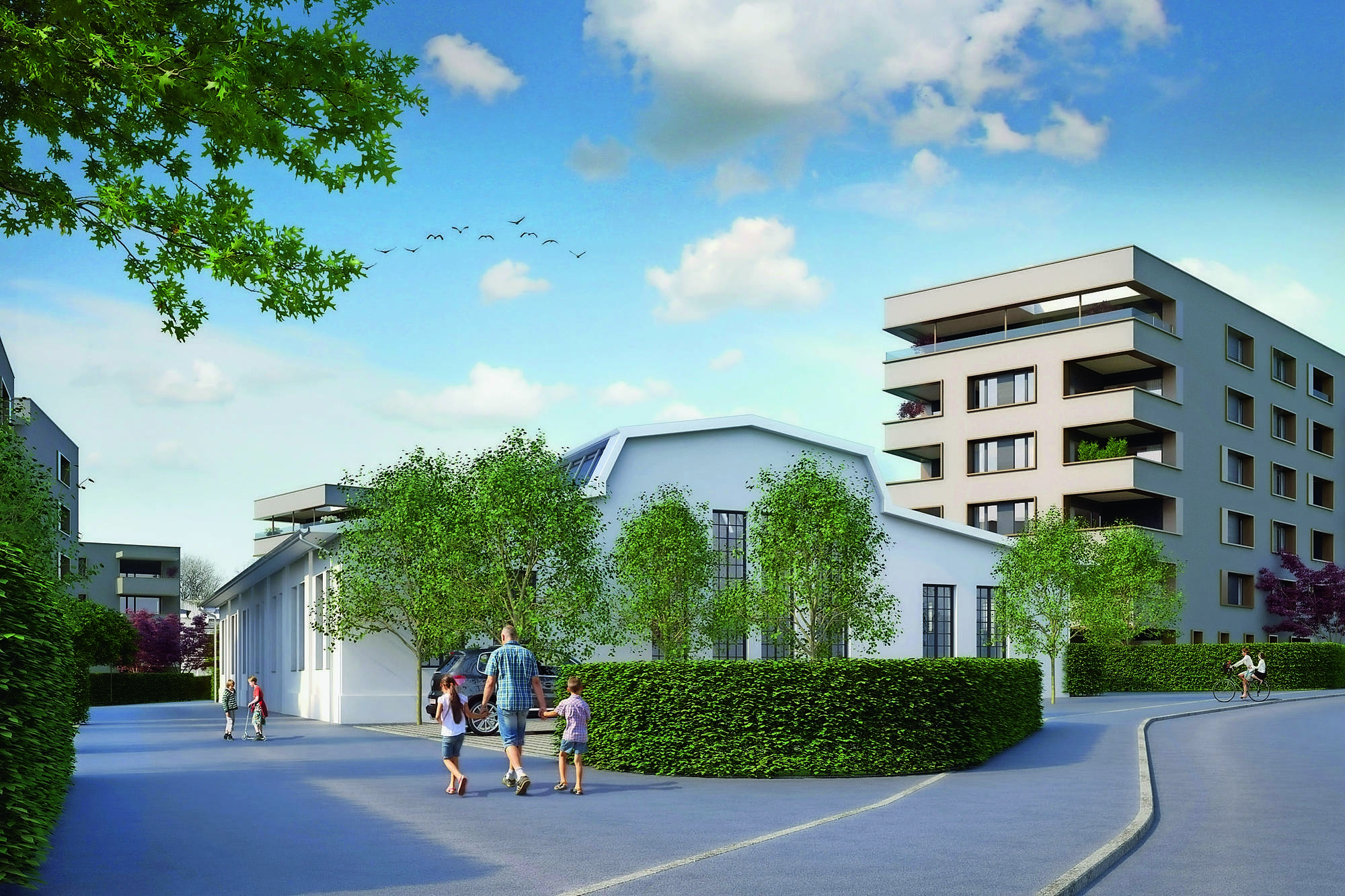 Aber auch in der Rhomberg-Heimat herrscht reger Baubetrieb. Neben den bereits erwähnten Projekten im Vorarlberger Oberland ist etwa der Bau in der Sankt-Gebhard-Straße in Bregenz anzuführen: In attraktiver Lage, zwischen Bahnhof Riedenburg und der Bregenzerach, entstehen zwei kombinierte Baukörper in Form eines Semiatriums mit Innenhof. Auf vier Etagen finden hier 45 Zwei- bis Vierzimmerwohnungen Platz. Ganz im Sinne der Nachhaltigkeit geht Rhomberg hier auch das Thema Mobilität neu an: In Kooperation mit dem Unternehmen Caruso-Carsharing wird den Bewohnern ein Elektroleihauto zur Verfügung gestellt, das auch Nachbarn der Wohnanlage nutzen können. In den ersten drei Jahren übernimmt Rhomberg die Kosten für dieses Service, wobei der Netzanschluss und die Stromkosten vom Partner VKW übernommen werden. Deren Geschäftsbereichsleiter für Energieeffizienz, Martin Seeberger, stellt fest: „Uns ist es wichtig, positive Anreize zu setzen, um das Mobilitätsverhalten der Vorarlbergerinnen und Vorarlberger nachhaltig zu beeinflussen. Carsharingangebote direkt vor der eigenen Haustüre gehören definitiv dazu.“ Die gleiche Kooperation wird es auch beim Rhomberg-Projekt Bäumlequartier am See in Lochau geben. Spatenstich in der Bodensee-Gemeinde kurz vor der deutschen Grenze ist im Herbst. Neben den entstehenden Neubauten ist auch die Eingliederung einer ehemaligen Fabrikshalle geplant. Das Bäumlequartier wird knapp 140 Wohn- und Gewerbeeinheiten umfassen.