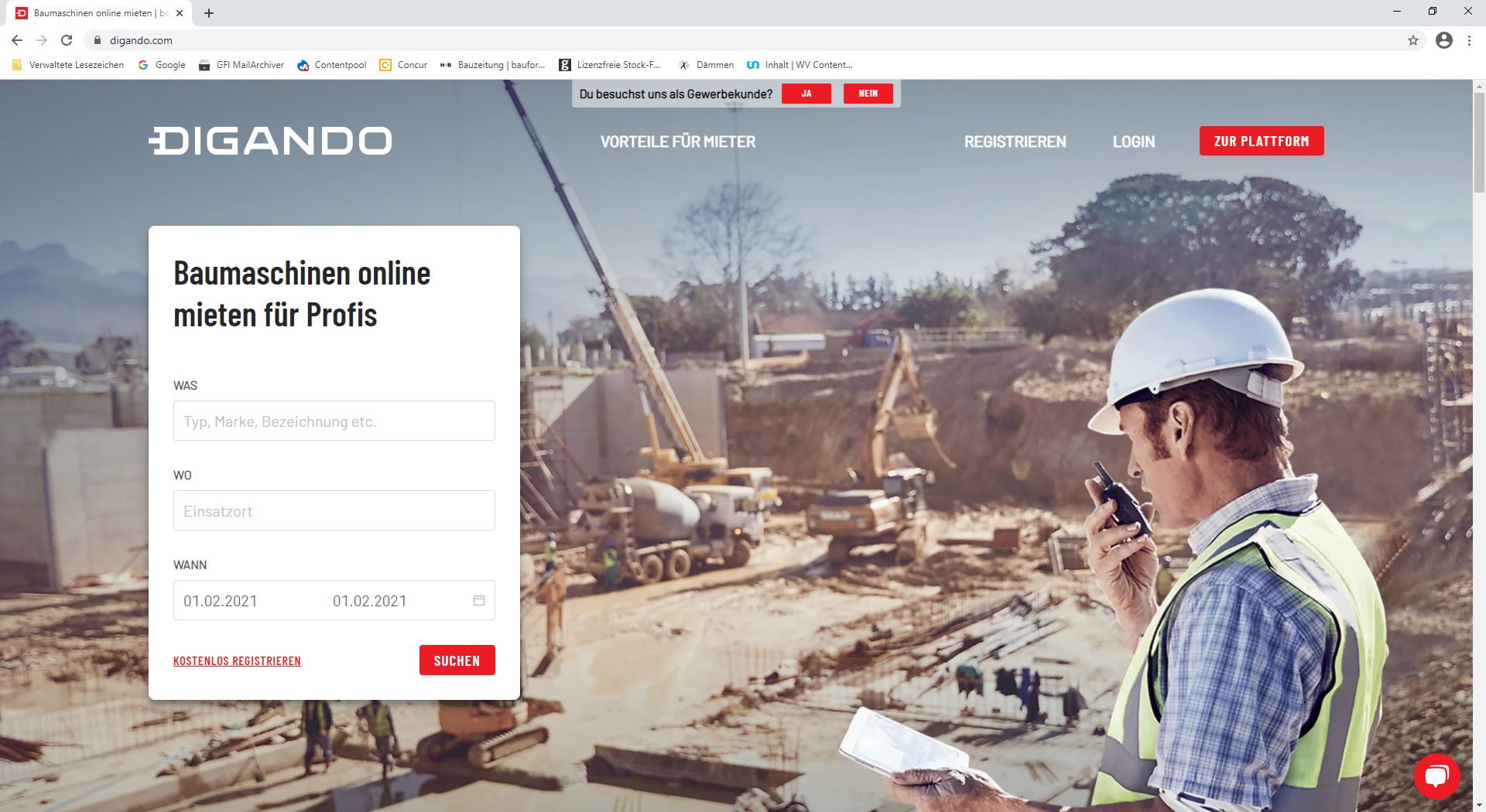 „Digando.com ist ein Marktplatz, der Mieter und Vermieter auf bestmögliche Weise zusammenbringen will“, erläutert Höss. Er ist überzeugt, dass der digitale Marktplatz noch deutlich an Bedeutung gewinnen wird. Der Geschäftsführer denkt etwa daran, dass in der digitalisierten Baustellenzukunft Planungstools automatisch Mietaufträge platzieren werden. „Eine IT-Schnittstelle zu einer zentralen Plattform statt unterschiedlicher Verbindungen zu mehreren Vermietern wäre dann ein gewichtiges Plus“, meint Höss.