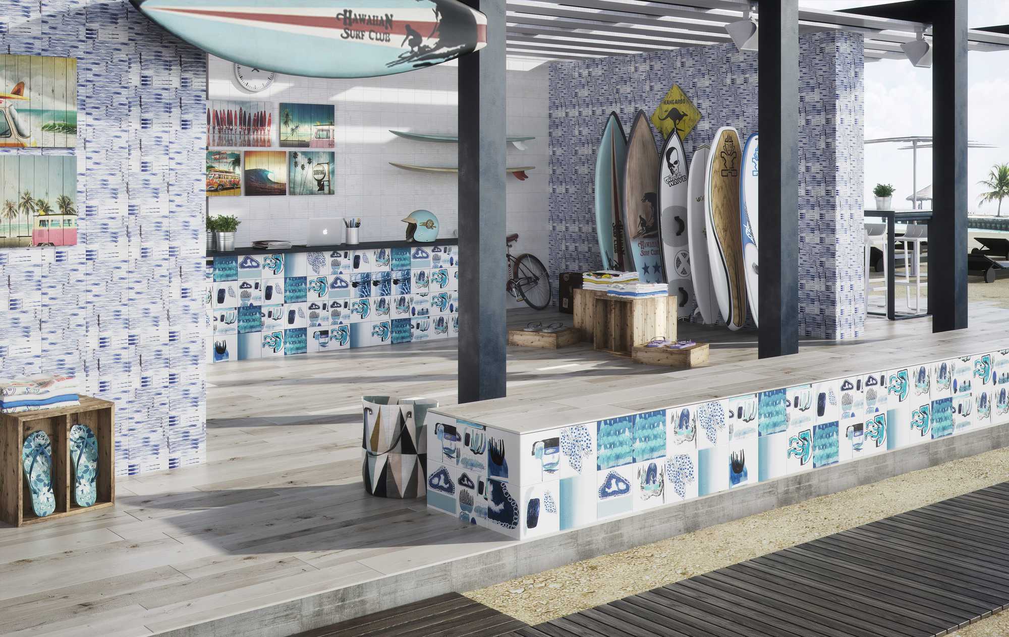 Rohe, unverputzte Wände, dazwischen Fliesen mit abgestoßen wirkenden Ecken, wild zusammengestellt, als wäre über die Jahrzehnte hinweg immer wieder etwas ausgebessert worden. Der ganze Raum erinnert an eine alte Markthalle mit Verladestation. Hinzu kommt ein Interieur, das den Namen Vintage auch verdient. Das ist das neueste Projekt des Designers Fancisco Segarra: dem Restaurant „La Guindilla“. Alle Fliesen in den Räumlichkeiten stammen aus der Kollektion FS By Peronda. Sein Stil ist vor allem geprägt durch unprätentiöse Dekore und authentische Retroausstattungen.