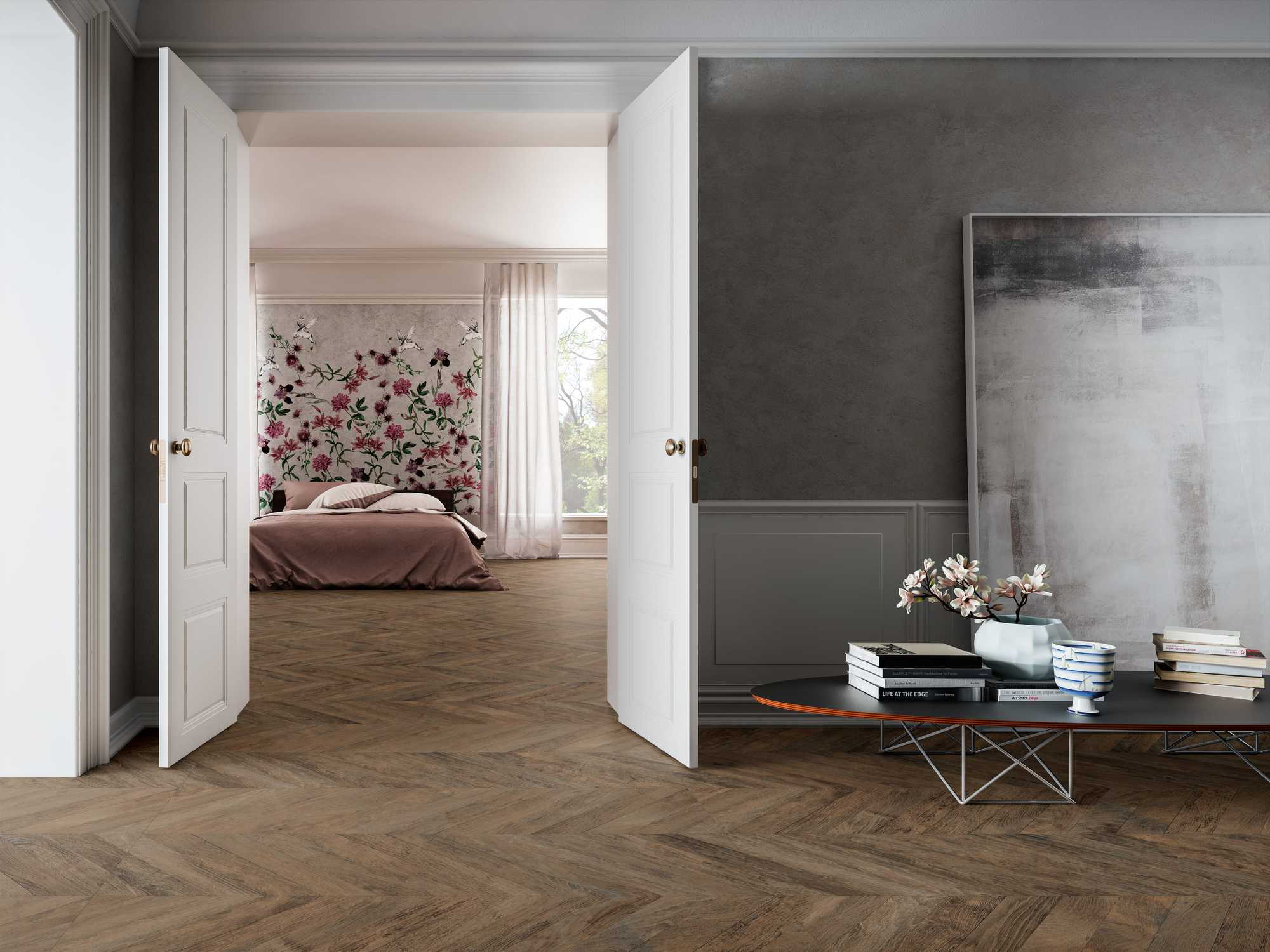 nach Holz sieht die Fliesenkollektion Chevron aus. Dabei dienten Französisches Fischgrätmuster und Parkett ungarischer Art als Inspiration.