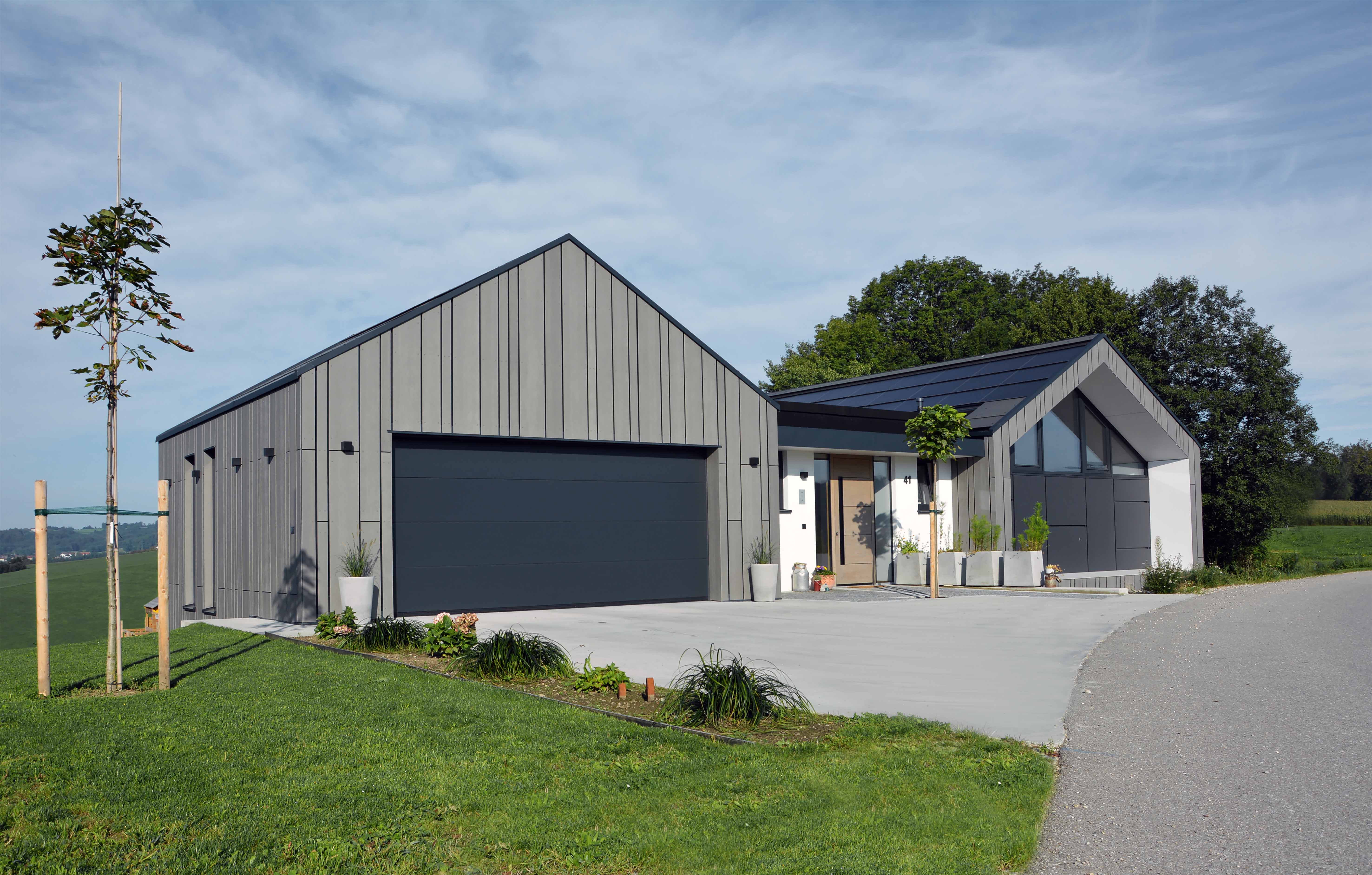 Das Wohnhaus ist eingebettet in die sanften Hügel des Hausruckwaldes und gewährt einen atemberaubenden Ausblick in das Seengebiet und die dahinterliegenden Berge. Beindruckend ist aber nicht nur die Lage, sondern auch das Gebäude selbst, das mit einer Vielzahl an natürlichen Materialien realisiert wurde. Das gesamte Obergeschoss etwa ist ein Holzhaus aus CLT-Brettsperrholz. An der Fassade wurde mit Eternit "Largo" Fassadenplatten aus natürlichem Faserzement und vertieften Schattenfugen ein modernes Erscheinungsbild mit Scheunencharakter geschaffen – angelehnt an alte Holzverschalungen. Das Dach wurde mit Großformatplatten verlegt und in Kombination mit dem Indach-Photovoltaiksystem "Sunskin roof" von Eternit zum kostenlosen Energielieferanten gemacht.