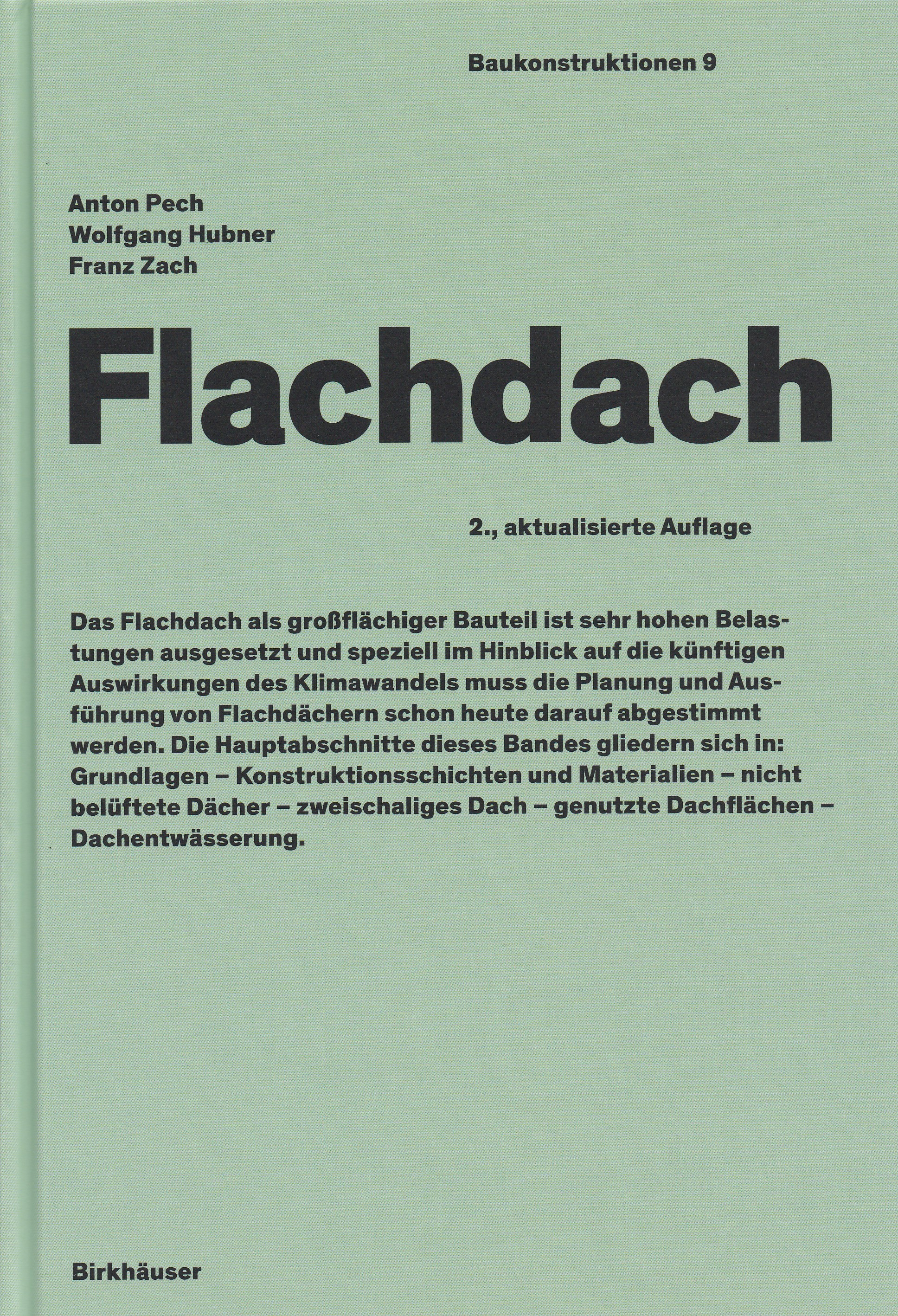 Die erste Auflage des österreichischen Fachbuchs Flachdach erschien 2010. Nachdem es in den letzten zehn Jahren am Flachdach bedeutende Weiterentwicklungen gegeben hat, wurde eine Überarbeitung durch das Autorenteam Pech/Hubner/Zach notwendig. Seit November 2021 ist die zweite, aktualisierte Auflage im Buchhandel erhältlich.