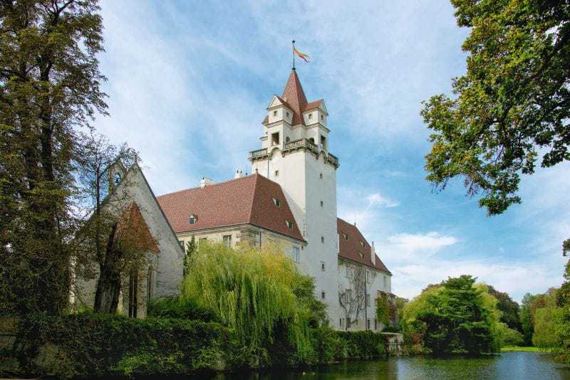 Das Ebreichsdorfer Wasserschloss blickt auf eine lange Geschichte bis ins Jahr 1294 zurück. Auch sein Dach. Das steile Dach wird an der Nord- und der Ostseite von zwei sechs- bzw. siebengeschoßigen Türmen überragt. Sie sind 27 bzw. 34 Meter hoch und stammen im Kern aus der zweiten Hälfte des 13. oder der ersten Hälfte des 14. Jahrhunderts. Während der nördliche Turm mit einem einfachen Zeltdach gedeckt ist, weist der östliche unter seinem Spitzhelm eine Renaissancegalerie mit vier Erkern über den Ecken auf.