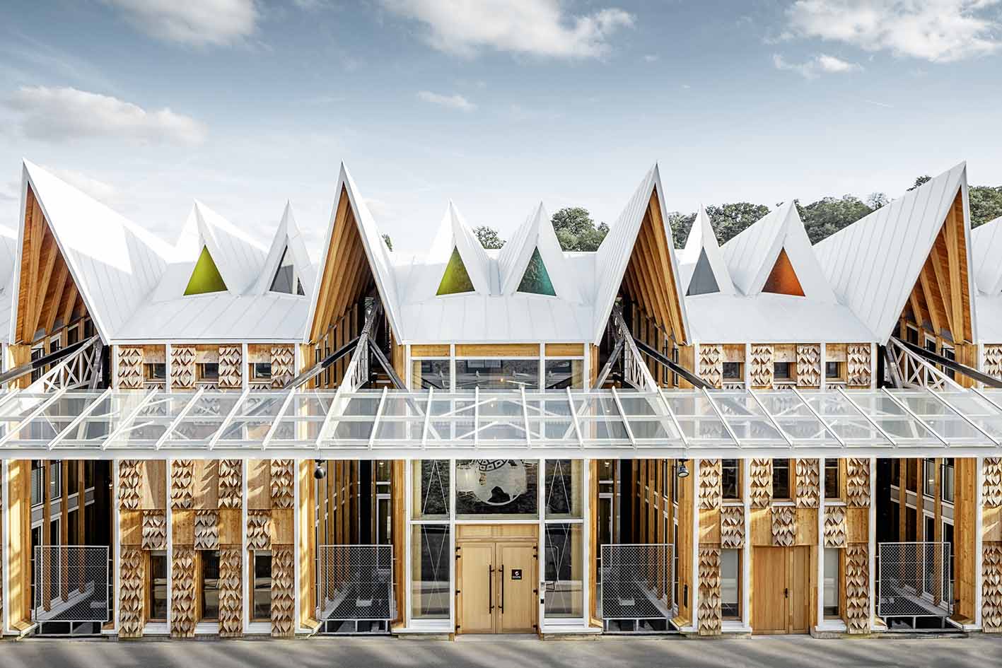 Das Gebäude ist in 15 kleine Häuser unterteilt. Sie werden durch die steilen Vordächer in Form von Spitzgauben, die steil zum Himmel zeigen, sichtbar. „Jede Abteilung bekommt ein eigenes Haus. Zudem sind die Stockwerke wie jene in Wohnhäusern aufgebaut – mit einer Gemeinschaftsebene und Büros zum Zurückziehen“, erläutert Lechevalier das Konzept. Die erste Idee war ein Stahldach, aber es musste feiner und leichter sein. „Wir suchten ein Material, das perfekt für die Details passt, denn die Vordächer wirken wie Origami“, berichtet der Architekt vom Entstehungsprozess.