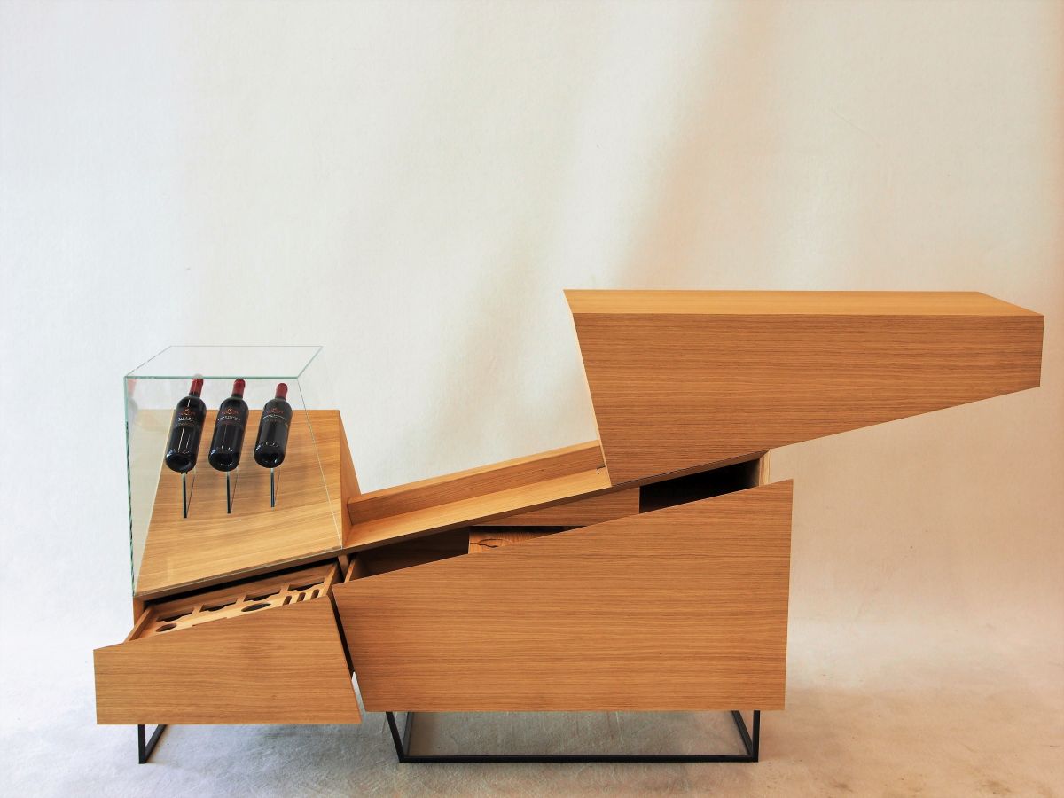 "Bestes Meisterstück Tischler" wurde das Wein-Präsentationsmöbel von Dominik Huber. Durch das seitliche Aufschieben kann es in ein Barmöbel verwandelt werden. Bei den Materialien hat sich Huber für eine schlichte Eiche in geölter Ausführung, Diamantglas und ein Fußgestell aus Metall entschieden. In der Präsentationsfläche haben drei Weinflaschen Platz, darunter befinden sich zwei große Schubladen für diverse Weinutensilien.