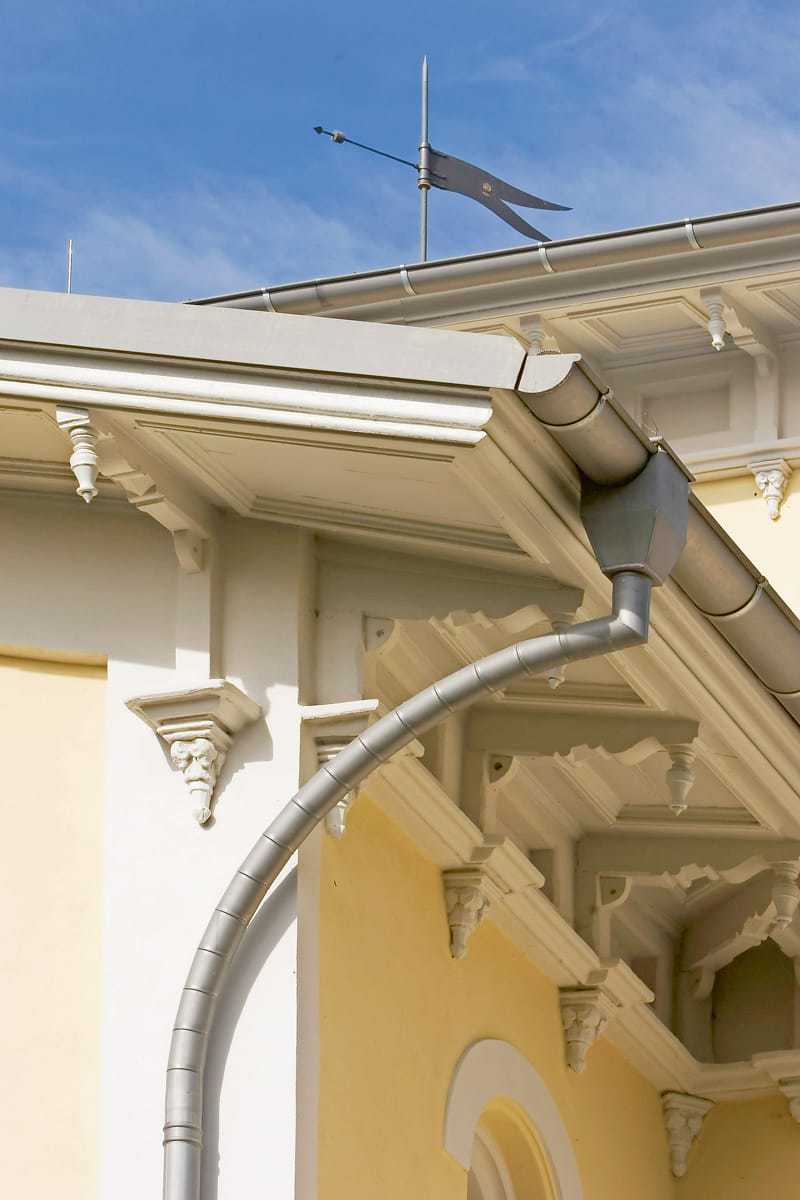 Für ein optimales und harmonisches Zusammenspiel zwischen Bedachungsmaterial und Dachentwässerung wurden Rinnen, Rohre und Zubehörteile ebenfalls in Quartz-Zinc ausgeführt. Als Zubehörteile kamen dabei nicht nur allgemein verwendete Standardprodukte wie Winkel und Rinnenboden zum Einsatz. Es wurden auch Wasserfangkästen und Gliederbogen (auch bekannt als Schwanenhals oder Schweizer Bogen) eingesetzt. So wurde aus der am Gebäude rein funktional notwendigen Dachentwässerung ein gestaltendes, architektonisches Detail.