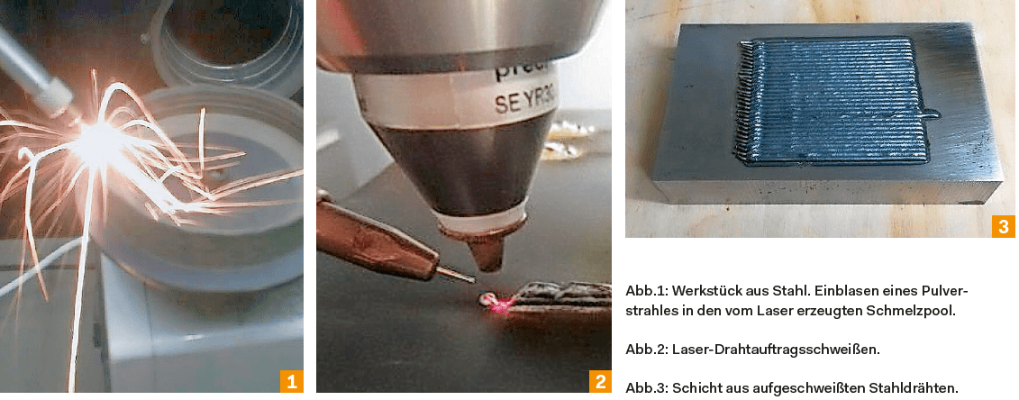 Noch höhere Verfahrgeschwindigkeiten kann man durch Schmelzen eines Drahtes mittels Laserstrahl und tropfenförmiges Auftragen auf die momentane Werkstückoberfläche erzielen, wobei allerdings die räumliche Auflösung weniger gut ist. Ein noch gröberer Auftrag allerdings mit wesentlich verbesserter Auftragsleistung kommt durch das Aufschweißen von Metalldrähten auf die momentane Werkstückoberfläche zustande, was bereits im Laserzentrum in Gmunden erfolgreich erprobt wurde (Abb.2 und 3).