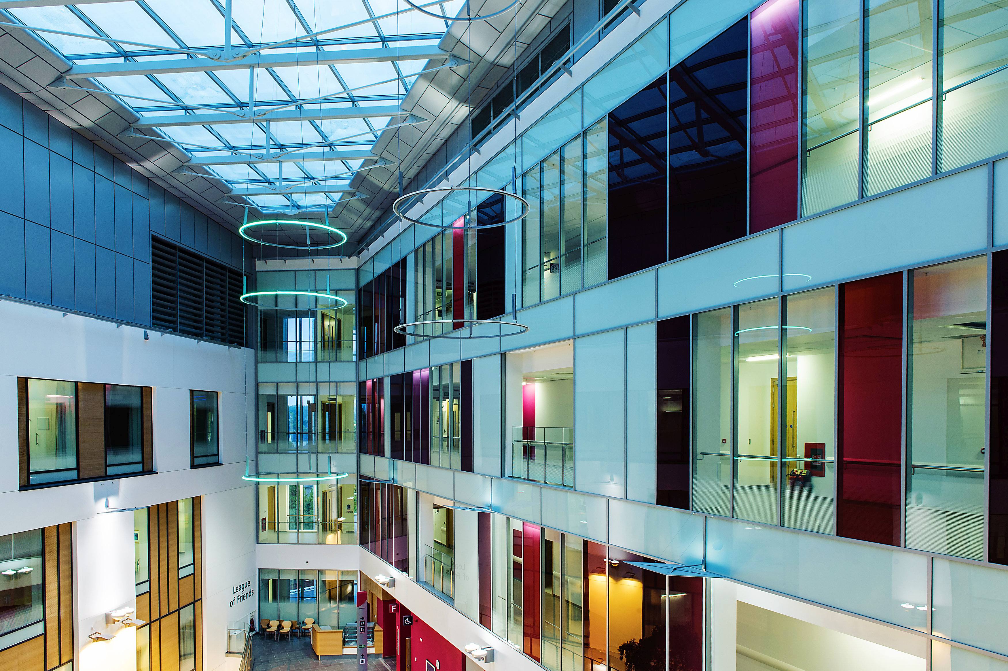 Eine ähnliche Wirkung haben die laminierten Brandschutzgläser "Pyroswiss E30 Stadip" in verschiedenen Farben im Southmead Hospital in Bristol: Aus den Fenstern der Klinikflure blicken die Patient*innen und Besucher*innen durch strahlend grüne, blaue, gelbe und rote Gläser in das mehrgeschossige Atrium (siehe Aufmacherbild).