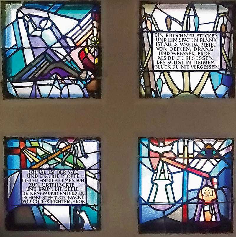 Wendet man sich den Glasfenstern des Künstlers im Hauptschiff zu, erkennt man auf einem die Geschichte des ägyptischen Josef aus dem Alten Testament, das andere zeigt die Geschichte des Nährvaters Josef aus dem Neuen Testament. Die beiden Josefszyklen sind auf sieben mal zwei Feldern in Schwarzlotzeichnung auf hellem Glas in zarten Pastellfarben gemalt. In der Seitenkapelle sehen wir zwei weitere Glasfenster, deren biblische Themen sich mit den „vier letzten Dingen“ befassen. Die vier quadratischen Felder enthalten Verse, die angeblich von Gütersloh selbst gedichtet wurden. Diese in kräftigen Farben gehaltenen Glasfenster stehen in reizvollem Kontrast zu den zart gemalten Glasfestern mit dem Josefszyklus. An der sorgfältigen Komposition erkennt man die intensive Auseinandersetzug des Künstlers mit der Gedankenwelt und Aussagekraft des Alten und Neuen Testaments.
