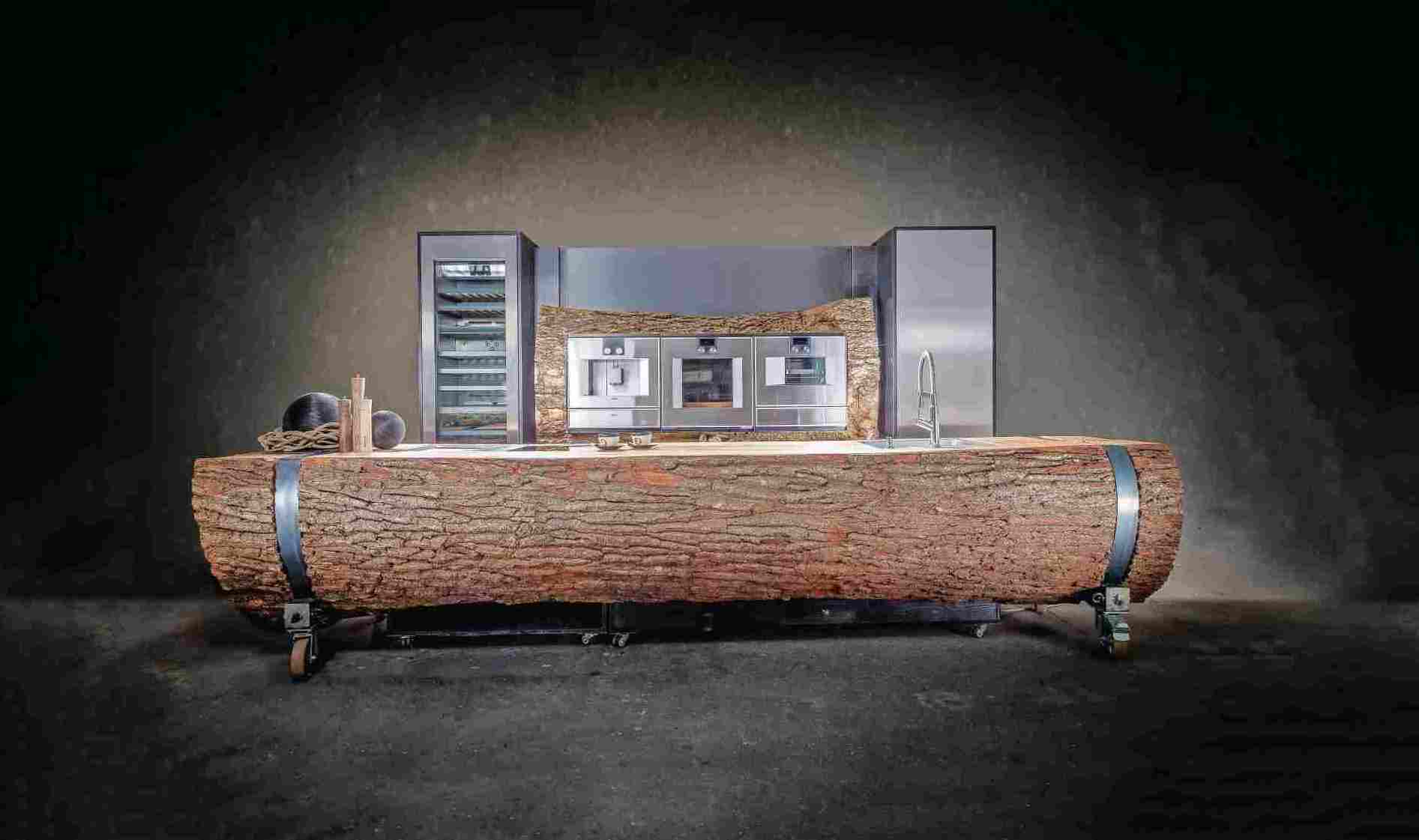 In dem vier Meter langen und fast 1800 Kilo schweren, durch Räder mobilen Unikat stecken rund 400 Arbeitsstunden. Die Plätze für die aus Schwarzstahl gefertigten Küchen-Unterkästen und die Edelstahlgeräte wurden mit der Motorsäge ausgeschnitten. Die Rinde wurde händisch gereinigt, an den Ecken mit Stiften fixiert und ebenso wie die Arbeitsfläche geölt. Der dreimonatige „Aufenthalt“ des mächtigen Stammes in der Trockenkammer ist in die Produktionszeit noch einzurechnen.
