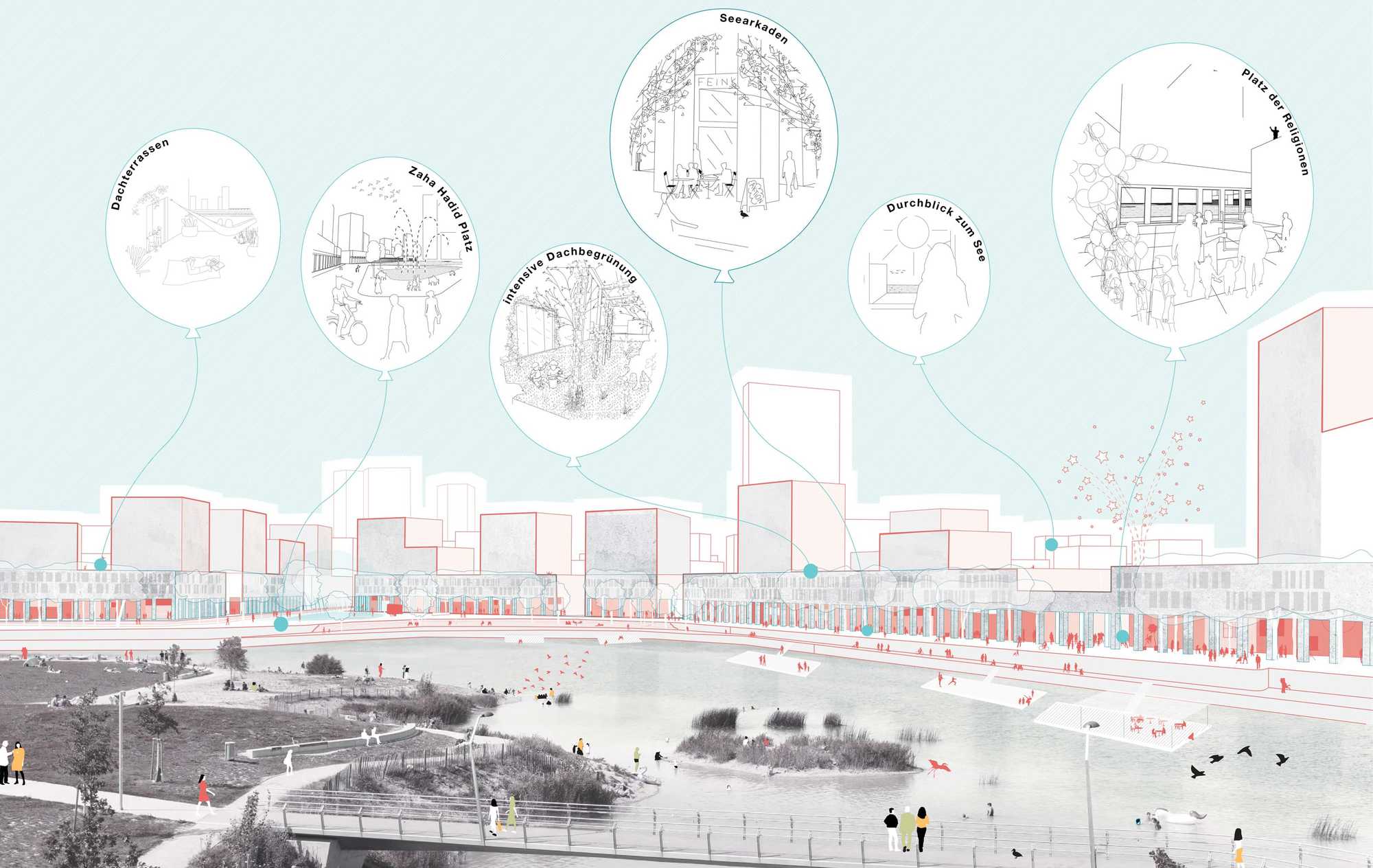 Mit einer auf dem Masterplan aufbauenden Detailierung werden nun optimale Voraussetzungen für alle Partner geschaffen, die das Quartier "Seeterrassen" mitentwickeln werden. Der Fokus des abgeschlossenen städtebaulichen Entwurfes liegt einerseits auf hohen Aufenthalts- und Wohnqualitäten, gut gestalteten Sockelzonen und nachhaltiger Umsetzung, andererseits mit der baufeldübergreifenden Herangehensweise den Investoren und Bauherren die Sicherheit zu geben, dass ihre Projekte ein hochwertiges Umfeld haben. Rund um großzügige grüne Innenhöfe findet sich der perfekte Ort für mutige Architektur und außergewöhnliche Nutzungsmischungen. Die abwechslungsreich gestaltbaren öffentlichen und privaten Räume schaffen ein spannendes Wechselspiel zweier Milieus.
