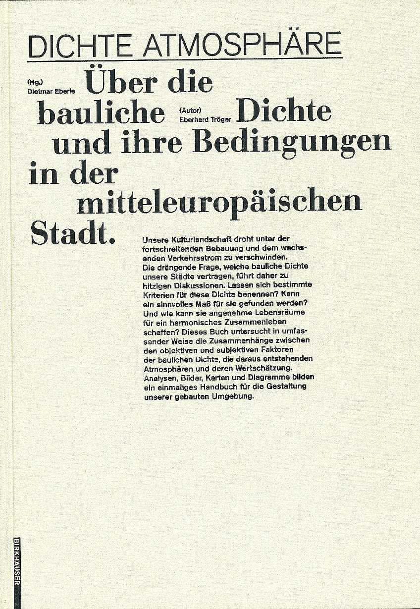 Dietmar Eberle hat als Professor an der ETH Zürich eine Reihe von Forschungsprojekten zu diesen Fragen in den Städten Berlin, München, Wien und Zürich initiiert und betreut. Eberhard Tröger hat aus dem umfangreichen Material ein monumentales Buch gemacht, nicht ohne die Hilfe der Fotografin Claudia Klein, die auch an der bemerkenswerten Gestaltung des Buches Anteil hat. Der Indikatorwert von Geschoßflächenzahlen (GFZ), wird, statt auf die Parzelle, auf den gesamten gewählten Quartierausschnitt (Perimeter) bezogen, sodass nicht bebaute private, halböffentliche und öffentliche Flächen ausgewiesen werden können. Untersuchungsgebiete sind je neun Perimeter homogener Dichte in neun Dichteklassen (von GFZ < 0,4 bis > 2,7) aus den vier untersuchten Städten. Untersucht werden die mögliche Orientierung der Menschen zu ihren privaten Räumen und zu Grünräumen, wenn vorhanden, oder zur Straße und anderen öffentlichen Flächen vor der Tür (wenn vorhanden).