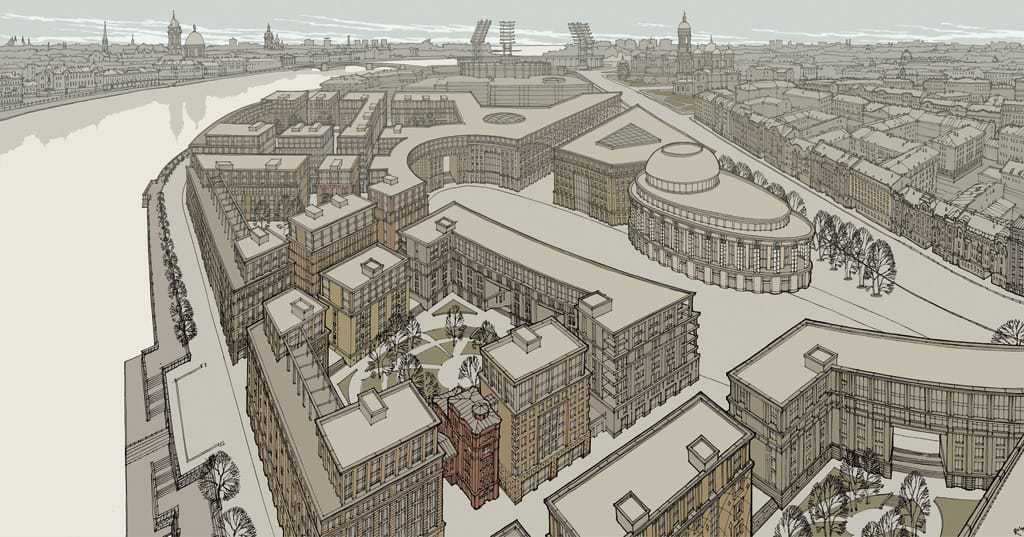 Das annähernd dreieckige Areal wurde von den Blickachsen hin zur Peter-und-Paul-Kathedrale auf der Haseninsel und zur mächtigen Isaakskathedrale hin mit der goldenen Kuppel konzipiert. Der Entwurf von Gerasimov/Tchoban führt nun die traditionellen stadtplanerischen Konzepte weiter: Die Gebäudeanlagen der Altstadt folgen vielfach den topografisch vorgegebenen Linien, weshalb man neben rechtwinkligen auch trapezförmigen, dreieckigen, fünfeckigen, konkaven oder geschwungenen Gebäuden und solchen mit scharfen Ecken begegnet. Manchmal vereint eine einzige Kreuzung mehrere solcher Gebäude. Diese Variationsfreudigkeit findet sich auch im Masterplan wieder. Tchoban/Gerassimov verstehen ihren Entwurf als klassisch moderne Interpretation der Stadt: Bezugnehmend auf die Architekturen der 300 Jahre alten Stadt vom russischen Barock bis zum klassizistischen Baustil Iwan Fomins haben sie eine geradlinig elegante Formensprache entwickelt, die Elemente aus der Gründerzeit wie Skulpturen und vorspringende Gebäudeteile mit schlichter Linienführung vereinigt.