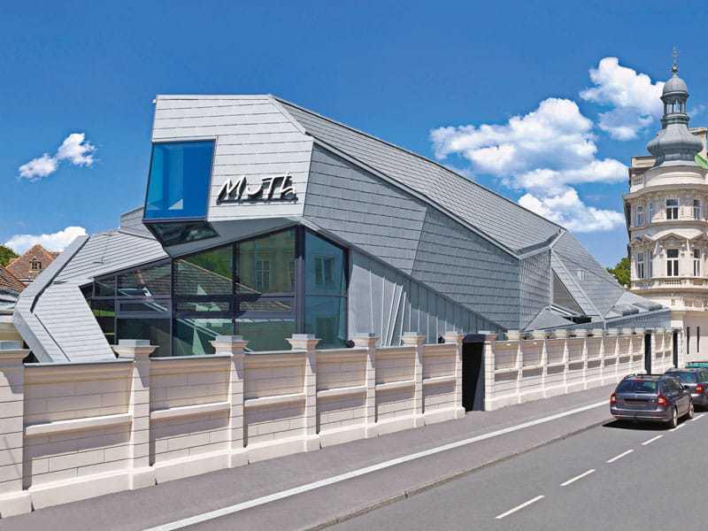 Die Ausführung der Dach- und Fassadenbekleidung der Konzerthalle MuTh stellte extrem hohe Anforderungen an den Verarbeiter, denn „an diesem Gebäude gibt es keine gerade Fläche. Alles verläuft schräg, und die Rauten rennen in einer Fuge um das ganze Haus herum“, erzählt Wolfgang Kalousek von der Kalousek Spengelerei und Metallkamine GmbH. Zudem legten Bauherr und Architekt größten Wert auf eine handwerklich saubere Ausführung. Zum Einsatz kam die Oberflächenqualität Rheinzink-prePatina blaugrau – in den steil geneigten Dachbereichen und an der Fassade im Großrautensystem, auf den flach geneigten Dachflächen im Doppelstehfalzsystem. Die Verlegung erfolgte auf folgendem Aufbau (von innen nach außen): Stahlbetonkonstruktion, Dampfbremse, hinterlüftete Holzkonstruktion mit zwischenliegender Wärme-