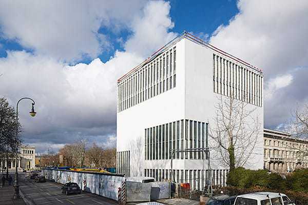 Die Architekten Georg Scheel Wetzel setzen den Kubus als Gegengewicht dazu: Die axiale Platzfiguration wird aufgebrochen und ein explizit asymmetrischer Akzent in das Gefüge gebracht. Mit der Seitenlänge und der Höhe von 22, 5 Metern überragt der Kubus das Ensemble von Nazibauten, mit denen in den Dreißigerjahren der Anschluss an die vornehmen klassizistischen Stadtviertel rund um den Königsplatz gesucht wurde. Ganz dezidiert stellt sich der geradlinig minimalistische Entwurf mit den länglichen Fenstereinlassungen als Gegenposition zur Vorliebe für einen heroisch historisierenden Baustil und entwickelt Spannung in dem historisch besetzten Ensemble. Auch die größere Gebäudehöhe markiert das Dokumentationszentrum als Außenseiter des Ensembles. Trotz der topografischen Umschließung durch die historische Bebauungsstruktur will der ungerichtete Kubus als Bauwerk autonom wirken. Annäherungen an den Villenstil des Stadtviertels mit seinen frontal ausgelegten Straßenfassaden entfallen.