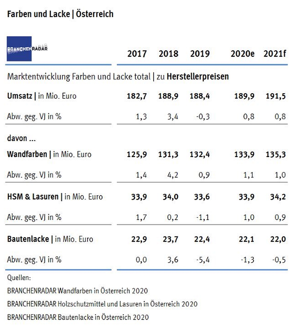 Der Markt für Farben und Lacke hat sich in Österreich 2019 nur noch seitwärts entwickelt. Bautenlacke drehten deutlich ins Minus, zeigen aktuelle Daten einer Marktstudie des Marktforschungsinstituts Branchenradar.