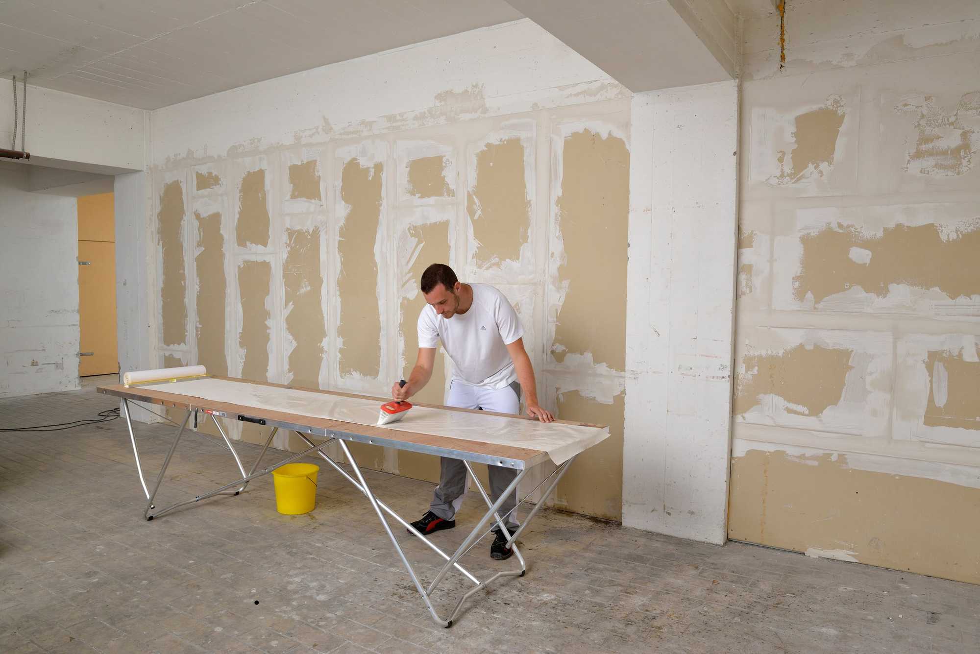 Für den Zwei-Meter-Tapeziertisch ist auch in kleineren Räumen ausreichend Platz. Durch seine geringen Abmessungen ist er für Tapezierarbeiten mit der Kleistermaschine geeignet. Er besteht aus einem stabilen Alurahmen mit Sperrholzplatte auf einem robusten Rohrklappgestell mit sicherer Verriegelung.