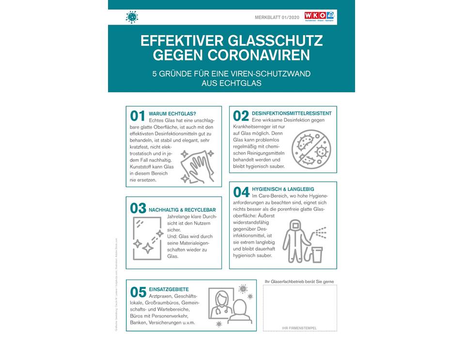 In den letzten Wochen sind anlässlich der Verbreitung des Coronavirus einige Merkblätter und Informationen zu Möglichkeiten und Anwendungen von Schutzverglasungen an die heimischen Glaserbetriebe verschickt worden. In diesen Merkblättern des Vereins Glas Österreich wird bewusst auf Echtglas gesetzt und die Vorteile hervorgehoben. Initiator Walter Stackler, Bundesinnungsmeister der Glaser, erläutert die Idee: „Wir als Interessensvertretung der Glaser wollen aktiv dafür sorgen, dass die Produktvorteile von Echtglas bekannt werden. In den Medien wird fast immer von ,Plexiglas’-Schutz gesprochen. Wir sehen es aber als unsere ureigene Aufgabe, die Menschen in diesen Zeiten mit effizienten Schutzverglasungen gegen Tröpfcheninfektion zu versorgen. Das ist unser zentrales Anliegen, und nicht, wie uns oft vorgeworfen wurde, andere Produkte schlecht zu machen“.