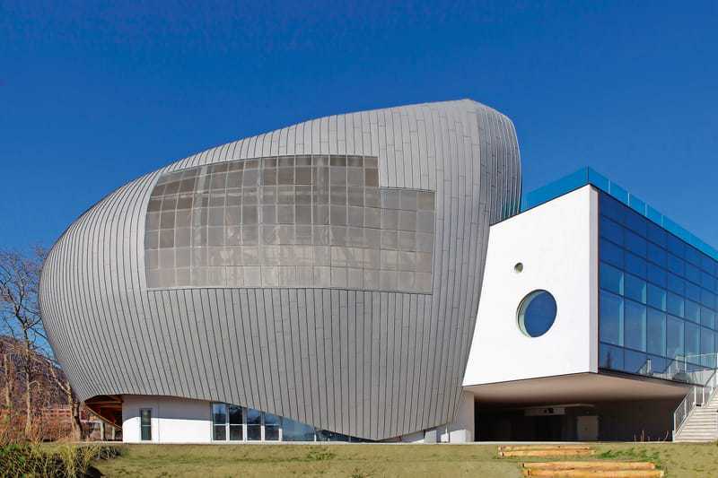 Das Centro Eventi Multifunzionale (CEM) ist in die Alpenlandschaft rund um den Lago Maggiore eingebettet. Bei der Gestaltung der vier Hauptgebäude orientierten sich die Architekten an den Kieselsteinen, die im angrenzenden See zu finden sind. Sie wählten Titanzink von VMZinc als Werkstoff für die komplexe Fassadengestaltung. Ohne einen Materialwechsel geht die Außenhülle von der Fassade in das Dach über und bildet so die gerundeten Formen der Steine nach. Die hier eingesetzte Winkelstehfalzdeckung eignet sich für die Verarbeitung an Fassade und Dach gleichermaßen und führt zu einem durchgehenden, strukturierten Erscheinungsbild. Die Planung des Kulturzentrums übernahmen ein Architektenteam rund um den Spanier Salvador Pérez Arroyo und das italienische Architekturbüro Architetti Bargone Associati. Ihr Ziel war es, das CEM möglichst eng mit der umliegenden Landschaft zu verzahnen. Federico Bargone erläutert: „Der Stein aus dem See ist das zentrale Symbol des Projekts.“ Er schildert, warum das Team sich ausgehend von dieser Idee für Titanzink entschieden hat: „Die Zinkbleche mit ihrer charakteristischen Schattierung und ihren lebendigen Farben bekleiden die vier Volumen, und ihre Farbe harmonisiert mit dem See und dem Himmel von Verbania.“