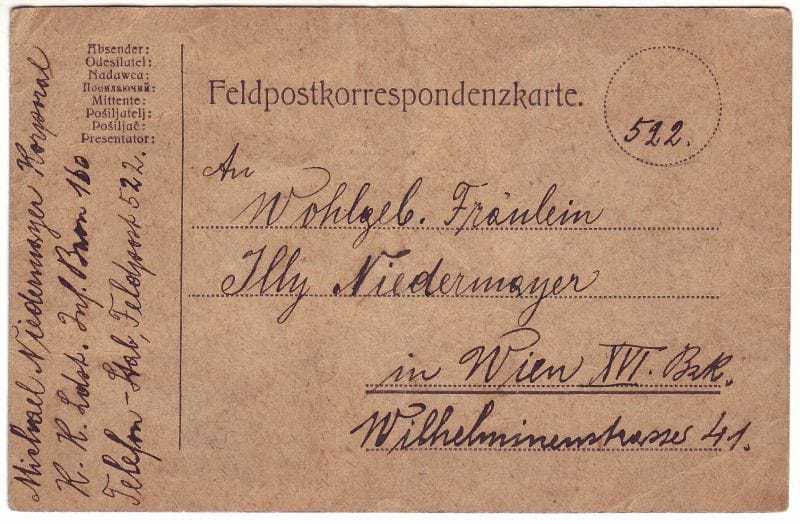 Liebevolle Post bekam dafür meine Mutter von ihrem Vater, Glasermeister Michael Niedermayer aus Ottakring. Zu Kriegsbeginn war sie acht Jahre alt. Ein Kriegskamerad malte für sie ein hübsches Bild auf eine Postkarte. Er sandte sie an seine „Liebste Illy … es grüßt und küsst dich vieltausendmal Dein Dich liebender Papa“. Diese Familie hatte Unterstützung vom 60-jährigen Großvater. Er half in den Betrieben seiner beiden Söhne aus. In den heutigen Glasereien Mager in Wien und May in Krems.