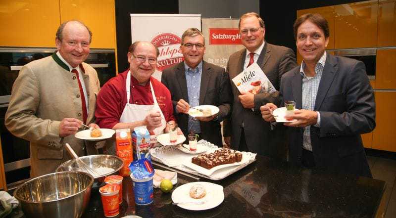 v.l. Alfred Fiedler (“Freunde der österreichischen Mehlspeiskultur“), Ernst Kronreif (Hohlwegwirt), Landesrat Josef Schwaiger, Martin Melzer (Geschäftsführer Miele Österreich), Christian Leeb, (Geschäftsführer SalzburgMilch) genießen österreichische Mehlspeisspezialitäten anlässlich der Pressekonferenz zum Weltmilchtag am 1. Juni in der Miele Galerie Wals