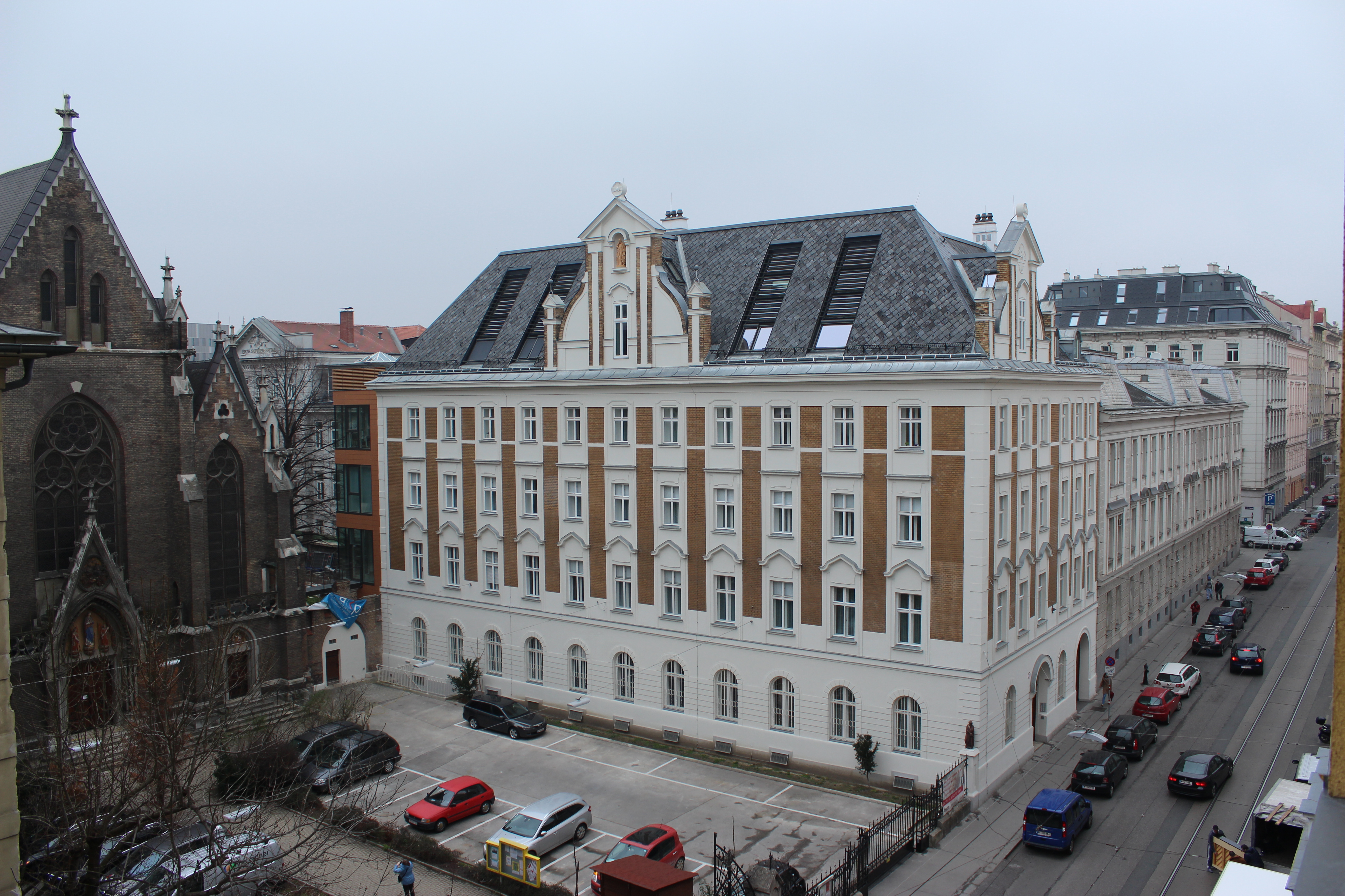 Österreichisches Projekt im Hiberatlas: Denkmalgeschütztes ehemaliges Konvent-Gebäude in Wien nach der Sanierung. Ziegelfassaden, Kastenfenster und Dachgauben aus der Gründerzeit wurden erhalten.