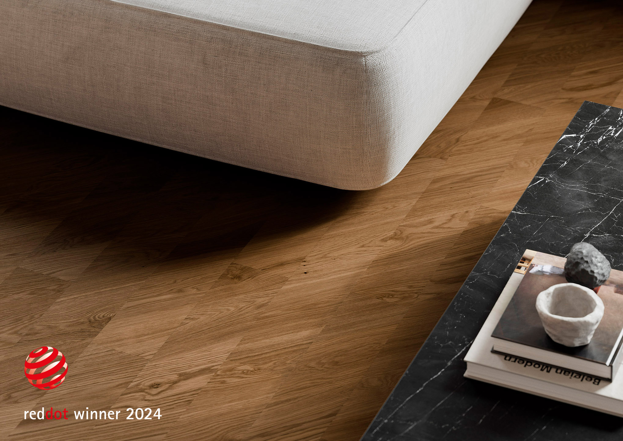 Im Grunde ist es bloß eine simple Drehung der Holzmaserung um 45°. Doch die mit diesem Design-Kniff verbundenen optischen Möglichkeiten der Fußbodengestaltung haben die 39-köpfige Jury des Red Dot Award 2024 überzeugt.