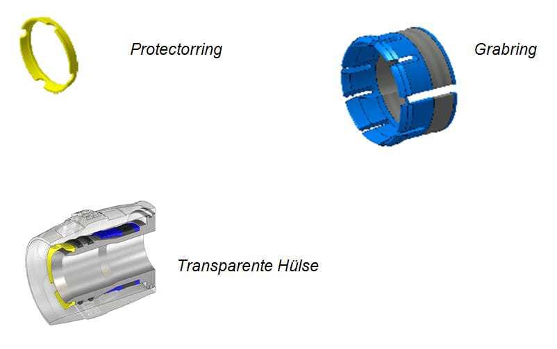 Die transparente Hülse, welche aus einem speziellen Polymer gefertigt wird, vereint Optik und Funktionalität. Das Design der Hülse wurde so gewählt, dass keine offenen Sichtfenster mehr benötigt werden, um die korrekte Montage des Fittings beurteilen zu können. Dadurch sind Verunreinigungen durch das Sichtfenster ausgeschlossen.