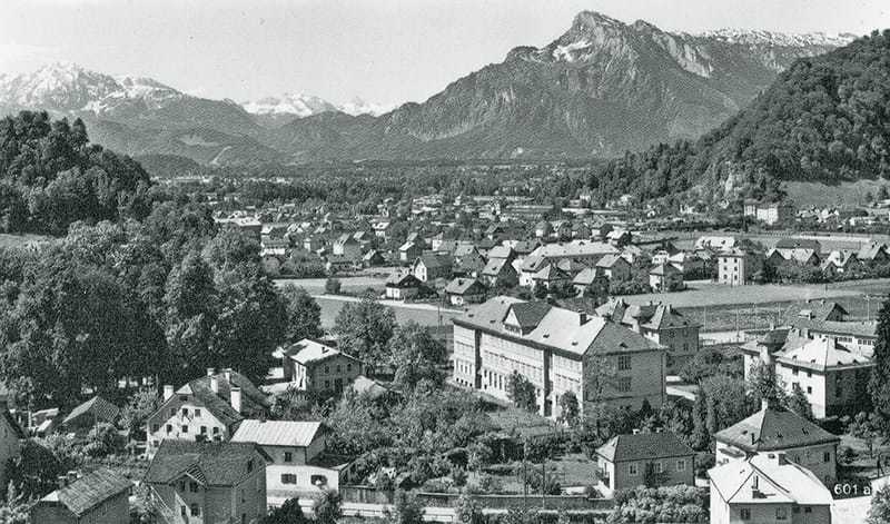 Wie auf dieser Fotografie der 1950er-Jahre wird auch heute noch der Stadtteil Gnigl vom Schulensemble von 1927/28 dominiert. Architekt Paul Geppert der Ältere hat die Schule und die beiden Lehrerwohnhäuser um ein platzartiges Zentrum gruppiert. Der Gestaltungsbeirat bedauert den Gesamtabriss, macht sich angesichts der fortgeschrittenen Planung zum „Bildungscampus“ immerhin für die Erhaltung des im Bild ganz rechts erkennbaren Lehrerhauses stark.