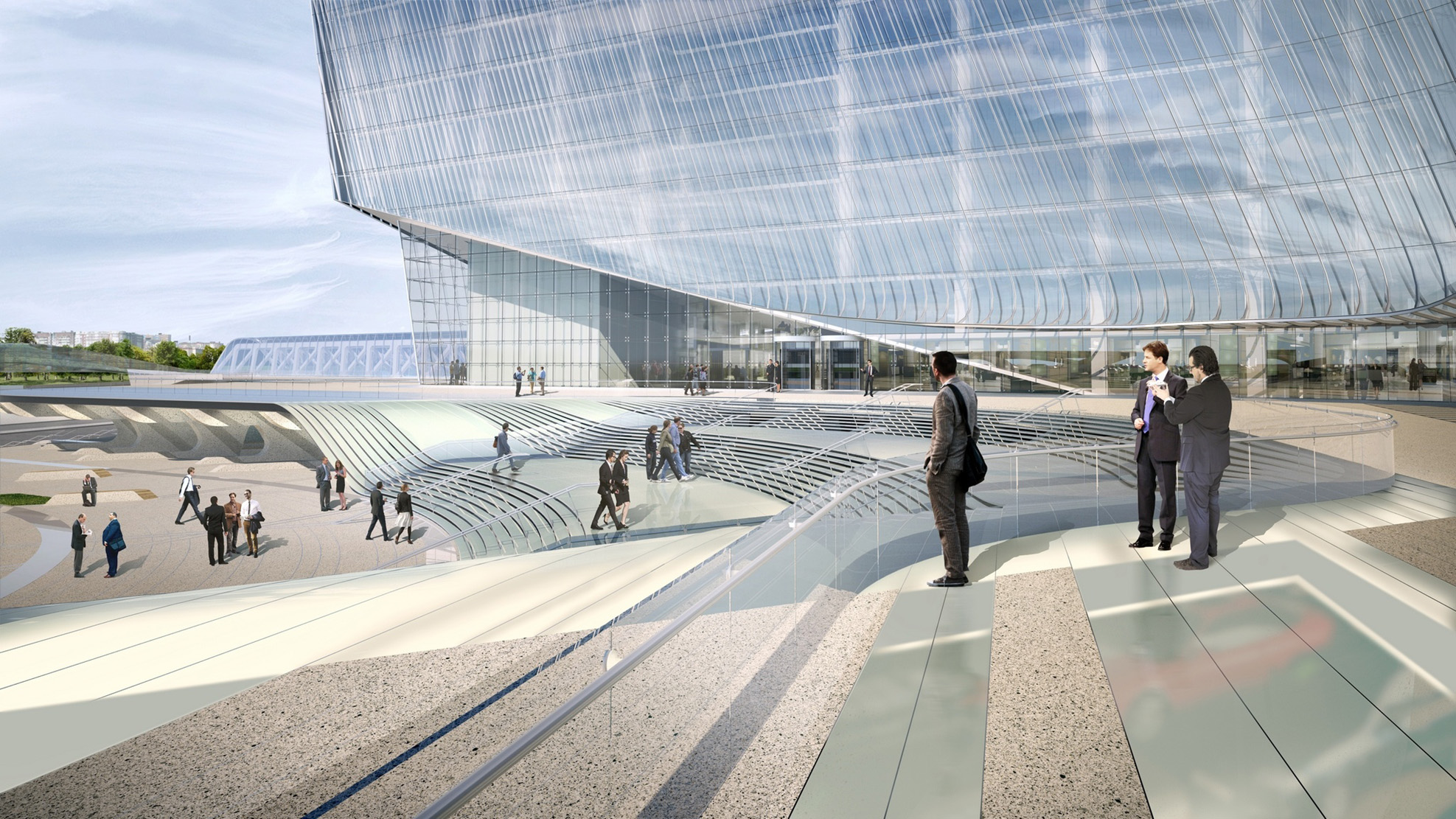 Die komplett von Glas umhüllten Bauten schwingen sich wellenartig vom Lakhta-Towers weg und steigen Richtung Wasser steil an. Um diese Offenheit für alle nach außen zu tragen, heben sich die zurückgesetzten Ecken im Nord- und Südwest-Teil signifikant und dadurch einladend vom übrigen Gebäude ab. Insgesamt 326 Glasfins tragen die Fassaden, die der Außenlinie der Bauten folgend nach oben hin spitz zulaufen. Dabei stechen die 17,2 Meter langen Fins heraus, die an den höchsten Stellen die Fassade tragen. Sie sind die aktuell längsten in einem Gebäude verbauten Glasfins.