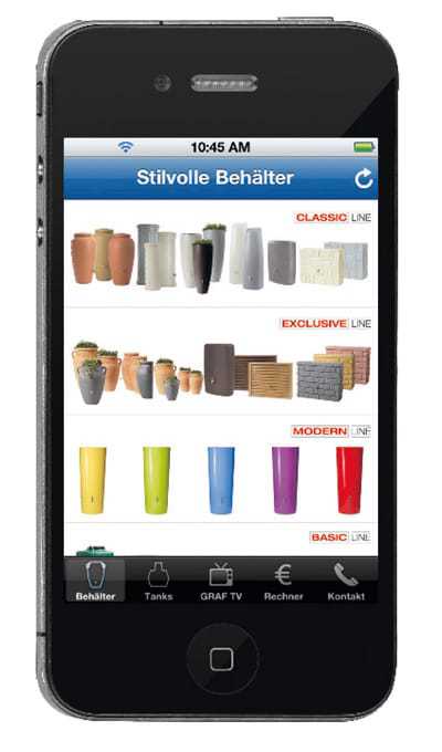 Mit der neuen App bietet Graf ein mobiles Beratungsstool beim Fachhändler oder vor Ort. Über das in den Smartphones und Tablets integrierte Reverse Geo Coding wird der Standort selbstständig ohne Eingabe der alternativ einzugebenden Postleitzahl bestimmt. Mittels verschiedener Parameter errechnet die App die jährliche Ersparnis bei der Inbetriebnahme einer Regenwassernutzungsanlage. Die Bildergalerie zeigt die Regenbehälter zur oberirdischen Aufstellung sowie Produktinformationen zu den unterirdischen Tanksystemen.