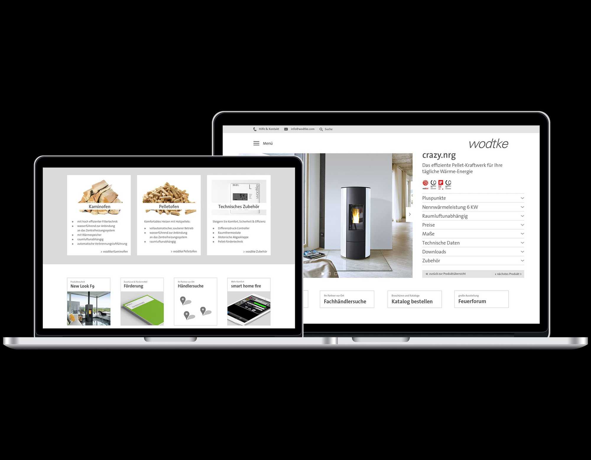 Ziel war es, den Usern von wodtke.com die Navigation so einfach wie möglich zu machen. Dazu gehören größere Bilder und eine neue, klare Struktur im Responsive Design zur optimalen Sichtbarkeit auf unterschiedlichen Endgeräten wie z.B. Smartphones, Tablets oder PC-Monitoren verschiedener Formate. Durch eine übersichtliche Menüführung gelangt der Besucher auf direktem Wege zu den gewünschten Produkten. Die Seite bietet außerdem ausführliche Informationen zu Fördermöglichkeiten, zu aktuellen Aktionen wie z.B. dem wodtke Umwelt Direkt-Bonus, oder eine Checkliste für den Ofenkauf. Erläuterungen zu wodtke smart home fire und zum wodtke Designverständnis runden die Seite ab.