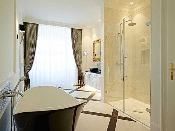 In den beiden großzügigen, modernen Bädern findet sich der imperiale Prunk in abgeschwächter Form wieder. Passend zum schwarzen Bett des Schlafzimmers setzt die Ausstattung eines der Bäder auf Bicolor: Sowohl auf dem Boden als auch in der Sanitärkeramik findet sich die Kombination von Schwarz und Weiß. Ergänzt werden die beiden „Nichtfarben" durch einen großen goldenen Spiegel sowie Accessoires und Armaturen in Chrom. Das Badezimmer des Master-Bedrooms – erreichbar durch eine diskrete Tapetentür hinter dem Himmelbett – ist zur Gänze in zartem Beige gehalten und verfügt über einen eigenen Ankleideraum. Die Eckbadewanne bietet genügend Platz für zwei „Honeymooner". Beide Bäder verfügen über Doppelwaschbecken, bodengleiche Rainshower-Duschen und sind mit Designheizkörpern ausgestattet. Die Toiletten sind dezent hinter satinierten Glastüren platziert.