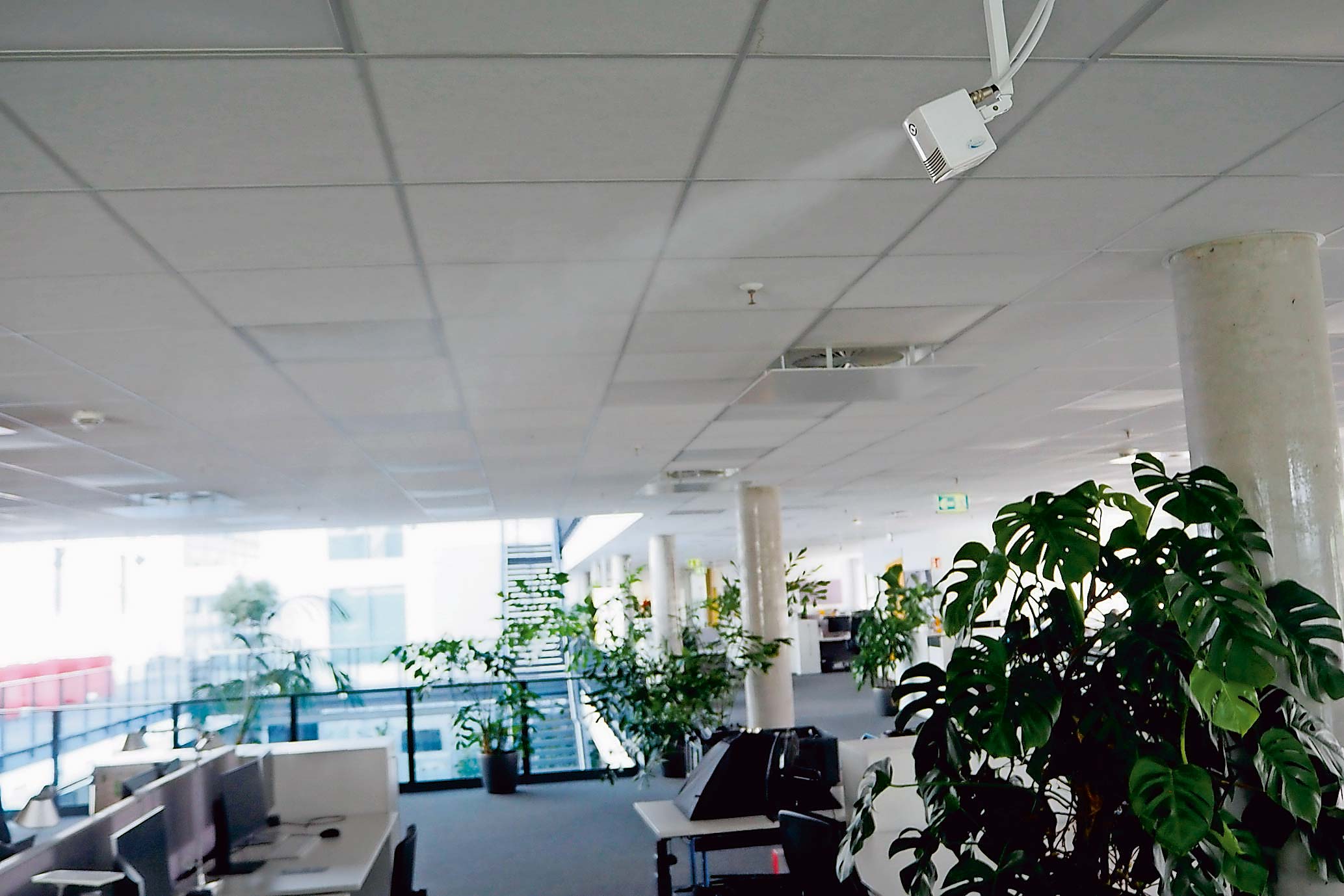 Über 70 Nanofog-Luftbefeuchter sind in den Open-Space-Büros im Einsatz und sichern dort ganzjährig eine optimale relative Luftfeuchte von 40 %. Sichtbar ist nur ein feiner Nebel, der erzeugt wird, wenn die Luftfeuchte unter den eingestellten Sollwert fällt. Die Regelung erfolgt über Hygrometer, die gleichmäßig verteilt auf den Büroflächen die Luftfeuchte messen und bei Bedarf die Befeuchtung aktivieren. Möglich wird die feine Vernebelung des Wassers durch eine Hochdrucktechnik und eine vorgeschaltete Wasseraufbereitung: Eine Hochdruckpumpe erzeugt einen Betriebsdruck von bis zu 70 bar und führt das Wasser über Hochdruckleitung zu den Luftbefeuchtern in den Räumen. „Die Installation war absolut problemlos und konnte bei uns sogar im laufenden Betrieb erfolgen“, beschreibt Jens Ringeling die einfache Nachrüstung der Luftbefeuchtung. Kernstück der Anlage ist die Wasseraufbereitung, die genau wie die Hochdruckpumpe in transportable Service-Container eingebaut ist.