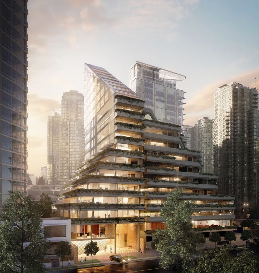 Die vielseitige Ästhetik von Gebäudehüllen aus Holz zeigt sich immer wieder eindrucksvoll in den Planungen des Architekturbüros Shigeru Ban. Im Herzen des Viertels Coal Harbour in Vancouver entsteht derzeit das 19-stöckige Wohngebäude Terrace House in hybrider Massivholzbauweise. Was den Pritzker-Preisträger besonders an dem Projekt gereizt hat, war die Lage, in direkter Nachbarschaft zu einem ikonischen Gebäude des kanadischen Architekten Arthur Erickson. Die Form des neuen Gebäudes ist eine direkte Reaktion auf drei Hauptbedingungen des Standorts. Daraus ergeben sich drei Themen: Erstens die Korrespondenz zum benachbarten, denkmalgeschützten "Evergreen Building" des kanadischen Architekten Arthur Erickson, zweitens der Wunsch, keinen Schatten auf den nahegelegenen Park zu werfen, und drittens die Erhaltung der bestehenden Aussichtskorridore zum Wasser und zu den Bergen. Im Projekt setzt sich die langjährige Kooperation des Büros Shigeru Ban mit dem international renommierten Holzbau-Experten Hermann Blumer fort. Zudem war die legendäre Landschaftsarchitektin Cornelia Oberlander Teil des Teams, die auch beim Projekt Evergreen Building von Erickson maßgeblich beteiligt war. So konnte die ursprüngliche Vision, die Umgebung maximal einzubeziehen, weiterentwickelt werden, und man spürt eine harmonische Kontinuität zwischen den Gebäuden. Terrace House besteht aus einer Betonkonstruktion für das Podium, den Turm und den Kern sowie aus einer Holzkonstruktion für die dreieckige Spitze des Gebäudes. Das Terrace House wird nach seiner Fertigstellung das höchste hybride Massivholzgebäude der Welt sein. Gleichzeitig setzt das Architekturbüro Shigeru Ban mit dem Bau eine markante Geste bezüglich Vancouvers Engagement für nachhaltiges Design und zukunftsweisende Holzbauweise.