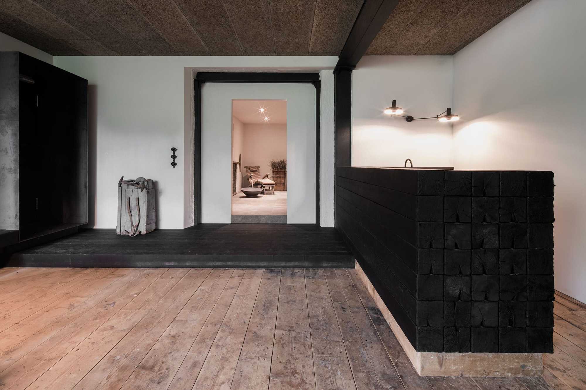 Sämtliche neuen Holzelemente wurden nach Vorbild der japanischen Shou Sugi Ban Methode behandelt. Bei dieser uralten Technik zur Holzveredelung, auf die das Destilat-Team während einer Fernortreise stieß, wird die Oberfläche verkohlt und im Anschluss geölt. Dadurch werden die alten Zirbenholz-Sessel und die neu produzierte Eichen-Möblierung wie das Podest, der große Tisch, die Bar und die Sitzbank farblich zu einer harmonischen Einheit verbunden.