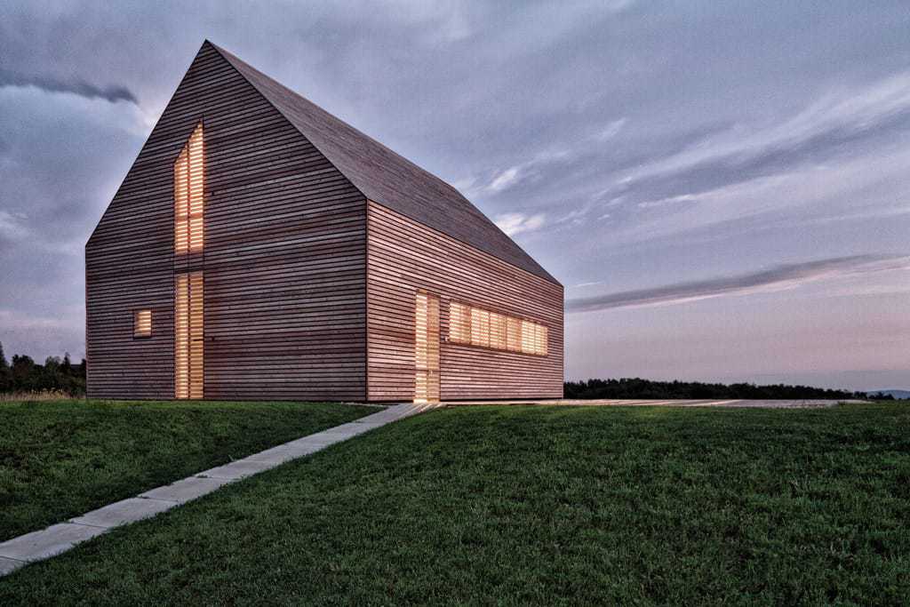 Sommerfrische. In der warmen Jahreshälfte wird alles wieder herausgeklappt: Die horizontalen Fensterläden und der Eingang werden hochgehievt und bilden gleichzeitig ein elegantes Verschattungselement für die vorgelagerte Terrasse, die ebenfalls aus Lärchenrost formuliert wurde. Auf der anderen Seite treten die Fensterläden – diesmal in vertikaler Richtung – elegant zur Seite, um die Aussicht in eine Landschaft voller Horizonte freizumachen. Die mit dem speziellen Klappmechanismus versehenen Gebäudeelemente wirken auch als Schutzmaßnahme vor sommerlicher Überwärmung, indem die Hülle komplett verschließbar ist. In geschlossenem Zustand kommt insbesondere die Reduktion auf ein einziges Material zur Geltung, das von seiner natürlichen Beschaffenheit geprägt ist und die Form des Projekts als Archetypus des Wohnhauses einmal mehr unterstreicht. Lediglich die scharfen Kanten der Kubatur werden durch Eckbleche aus Kupfer ausgebildet, die sich jedoch farblich komplett dem Rest der Gebäudehaut unterordnen. Das Sommerhaus im Burgenland von Judith Benzer wurde mit dem Burgenländischen Holzbaupreis 2012 ausgezeichnet.