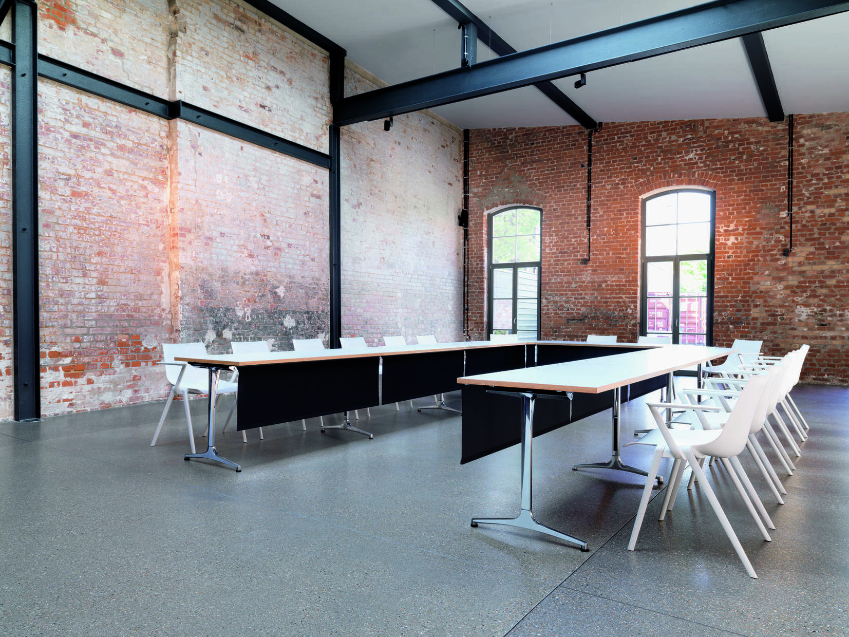 Mit mAx hat der Designer Andreas Störiko ein neues Klapptischsystem entwickelt, das alle Vorteile dieses Tischtyps optimiert und gleichzeitig die Nachteile eliminiert: Der patentierte Klappmechanismus ist mit einer Hand bedienbar, stabilisiert sich selbst, ist gegen Fehlbedienung gesichert und integriert alle Stapel- und Verkettungsfunktionen. Das führt zur schnellen, kostensparenden und sicheren Handhabung, sorgt für enorme Stabilität und kommt ohne lose Zusatzelemente aus, die im Zweifelsfall verloren gehen. Dabei vermittelt die Ausführung des klappbaren T-Fußgestells aus modelliertem Aluminium-Druckguss einen ausgesprochen hochwertigen und eleganten Eindruck jenseits der bekannten Klapptisch-Ästhetik. Drei Tischfuß-Größen bieten Tischtiefen und Tischbreiten für unterschiedliche Nutzungen: von Einzeltischen über verkettete Tischreihen bis zu Konferenztischanlagen. Ob im Vorstandsbereich, in Seminarzentren, Projektarbeitsräumen, Coworking-Arealen oder Cafeteria-Zonen – mit mAx „klappt“ wirklich alles und überall.