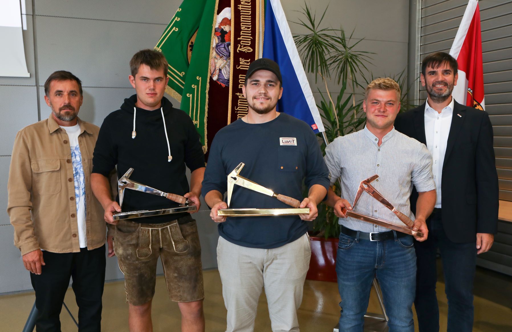 Die beiden Bundesinnungsmeister-Stv. gratulieren den strahlenden Siegern des Spengler-Bewerbs.