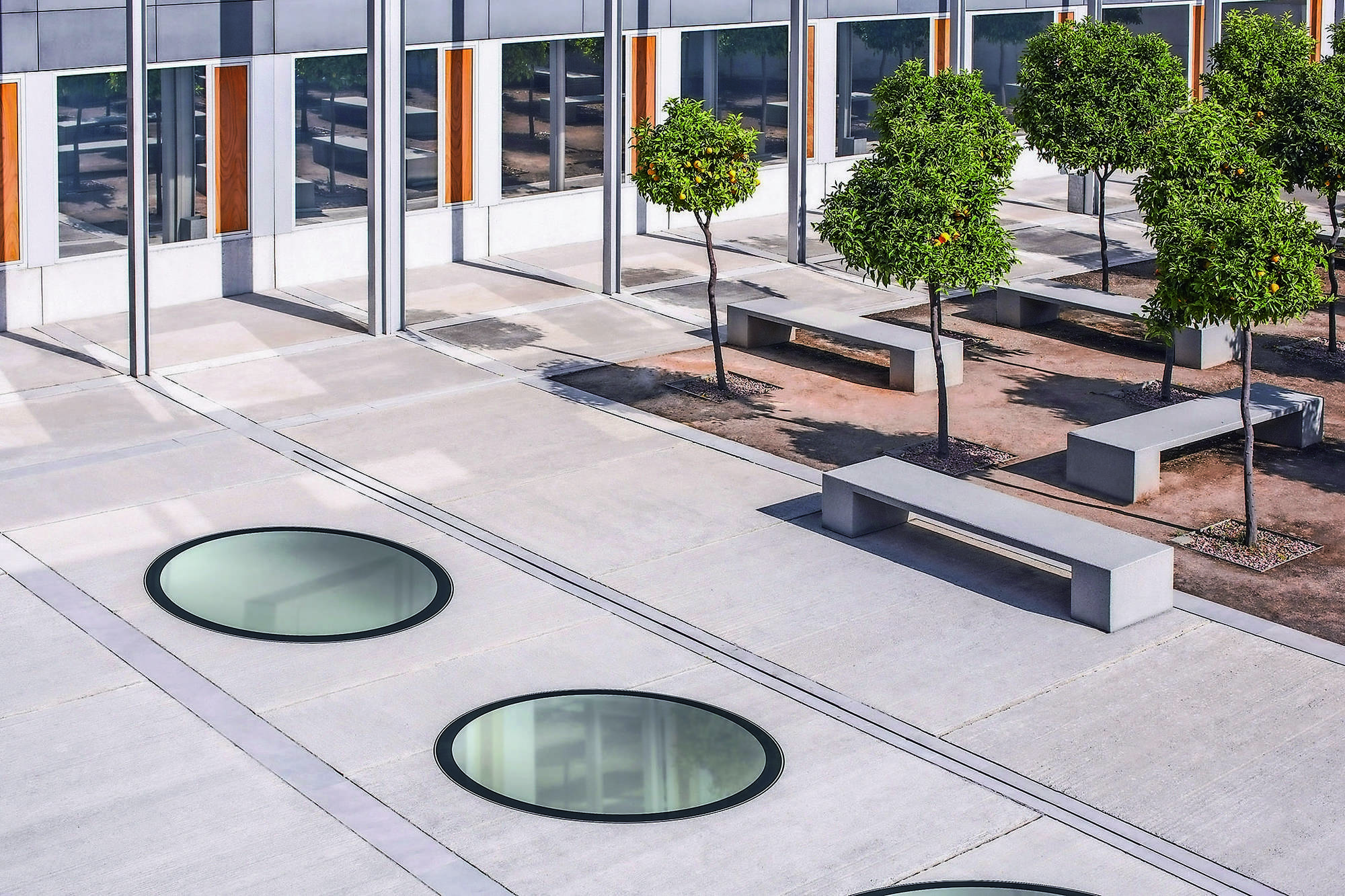 Das modulare Glasoberlicht-Komplettsystem Skyfloor BF eignet sich für den Einsatz in horizontal planen Decken- bzw. Bodenflächen und erfüllt höchste Ansprüche an Isolation, Schalldämmung und Durchsicht. Die hohe Transparenz des Oberlichts sorgt auch in unterirdisch liegenden Räumen und Gängen je nach Tagesverlauf für natürliche Belichtung. Und in ihrer Funktion als Lichtleiter fungiert die Verglasung auch umgekehrt, denn nachts schaffen etwa elektrisch beleuchtete Räume durch das Oberlicht im Außenraum helle Orientierungspunkte. Das System von Taghell überzeugt aber auch durch seine makellose Integration, denn das Bodenfenster fügt sich barrierefrei in seine Umgebung ein. Hochwärmegedämmt, einbruchsicher und wasserdicht wird es nach Maß gefertigt und auf den individuellen Anspruch der Architektur angepasst. Das filigran in Edelstahl eingefasste, isolierte Glas ermöglicht so eine ganzflächige Nutzung von Terrassen-, Garten- und Verkehrsflächen und es wird wahlweise 2- oder 3-fach verglast. Ob rund, quadratisch oder als rechteckiges Lichtband wird das Oberlicht individuell in jeder Form ausgeführt und so zum Gestaltungselement des jeweiligen Architekturkonzepts. Mit Rutschhemmung, Sichtschutz oder Beheizung ausgestattet lässt sich das Flachdachfenster Skyfloor BF an jede Situation anpassen. Als Skyfloor BB ist das begehbare Oberlicht auch ungedämmt für den Innenraum-Einbau erhältlich oder in der Variante BS als begehbare Brandschutzverglasung in den Feuerwiderstandsklassen F30 oder F90.
