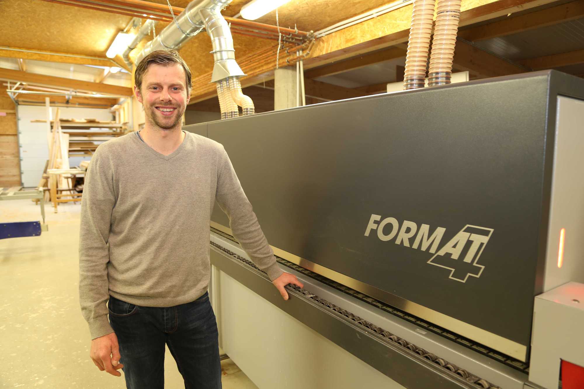 Im Frühjahr hat der innovationsfreudige Tischlermeister wieder in seinen Maschinenpark investiert – und sich eine neue Kantenanleimmaschine am letzten Stand der Technik zugelegt – eine Tempora 60.12 in der „E-Motion“-Ausstattung, die sich komplett über das große Touchpanel steuern lässt.